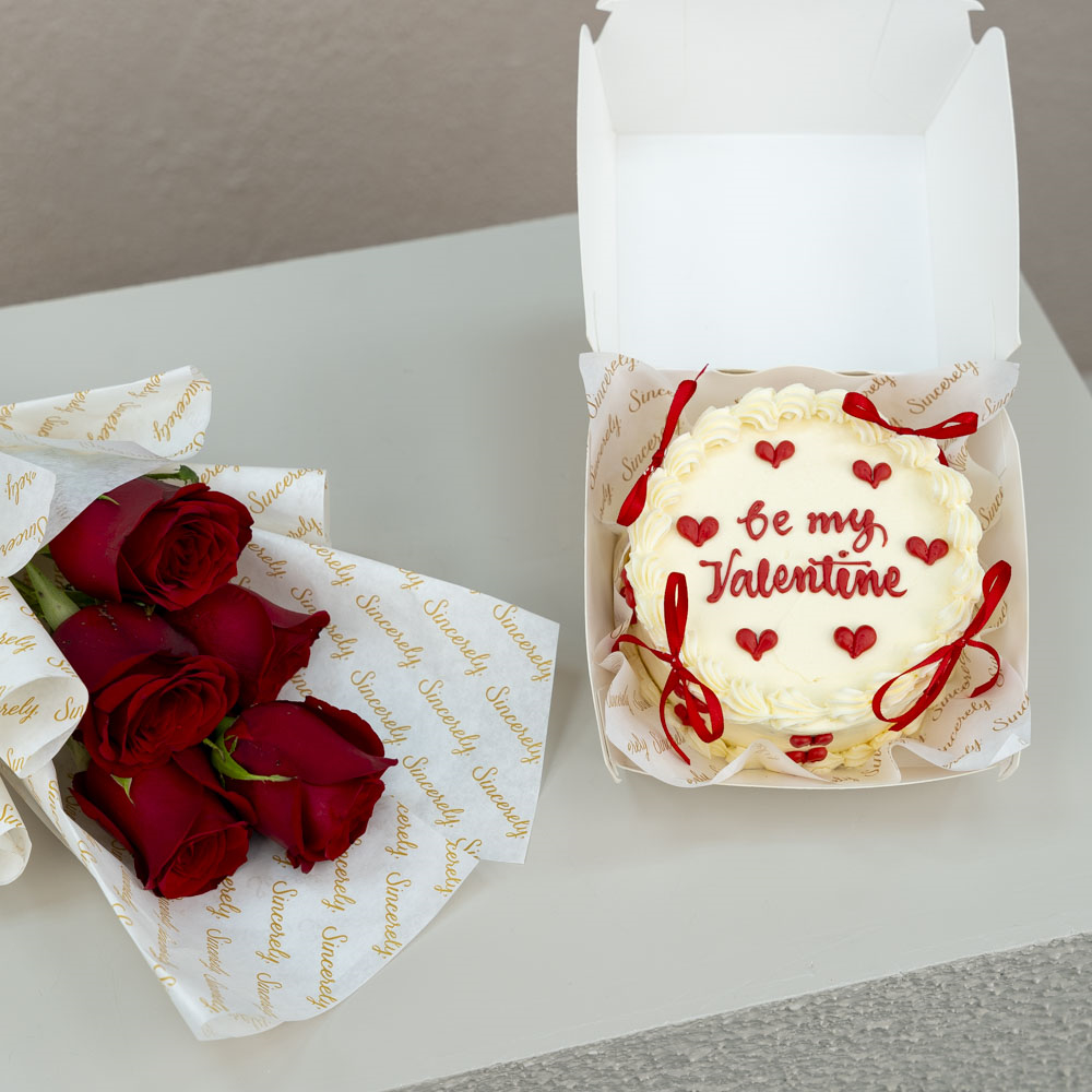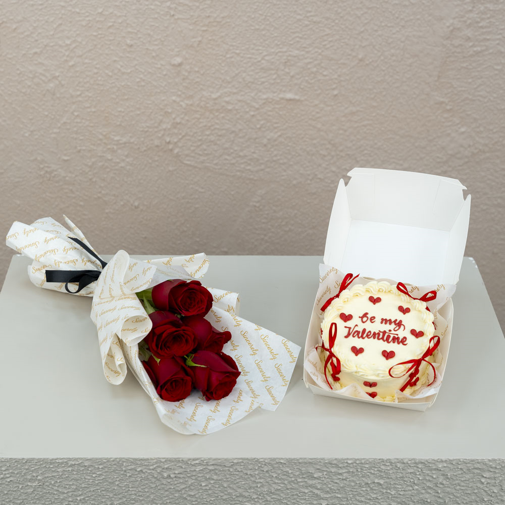 Yummy 4 inches chocolate cake for 2 persons served In a carton box with a hand bouquet of 5 stems of roses.