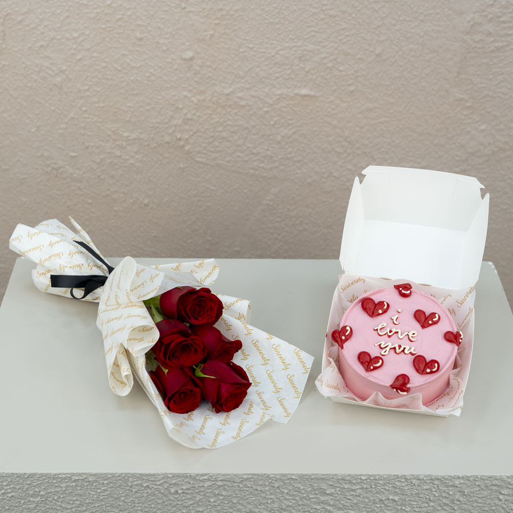 Yummy 4 inches chocolate cake for 2 persons served In a carton box with a hand bouquet of 5 stems of roses.