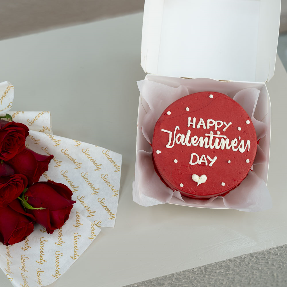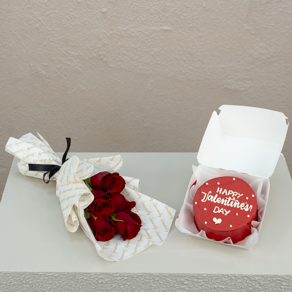 Yummy 4 inches chocolate cake for 2 persons served In a carton box with a hand bouquet of 5 stems of roses.