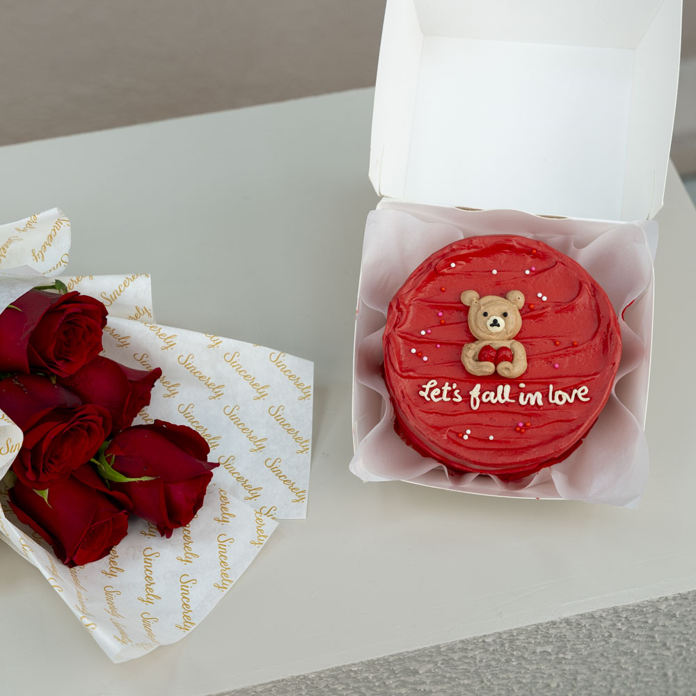 Yummy 4 inches chocolate cake for 2 persons served In a carton box with a hand bouquet of 5 stems of roses.