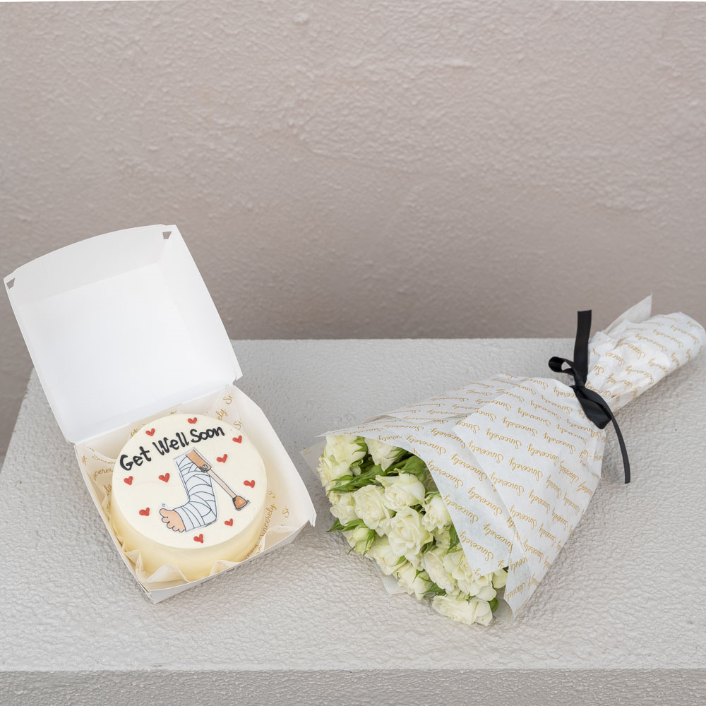Yummy 4 inches bento lunch box chocolate cake for 2 persons served In a carton box with a small bouquet of baby roses.