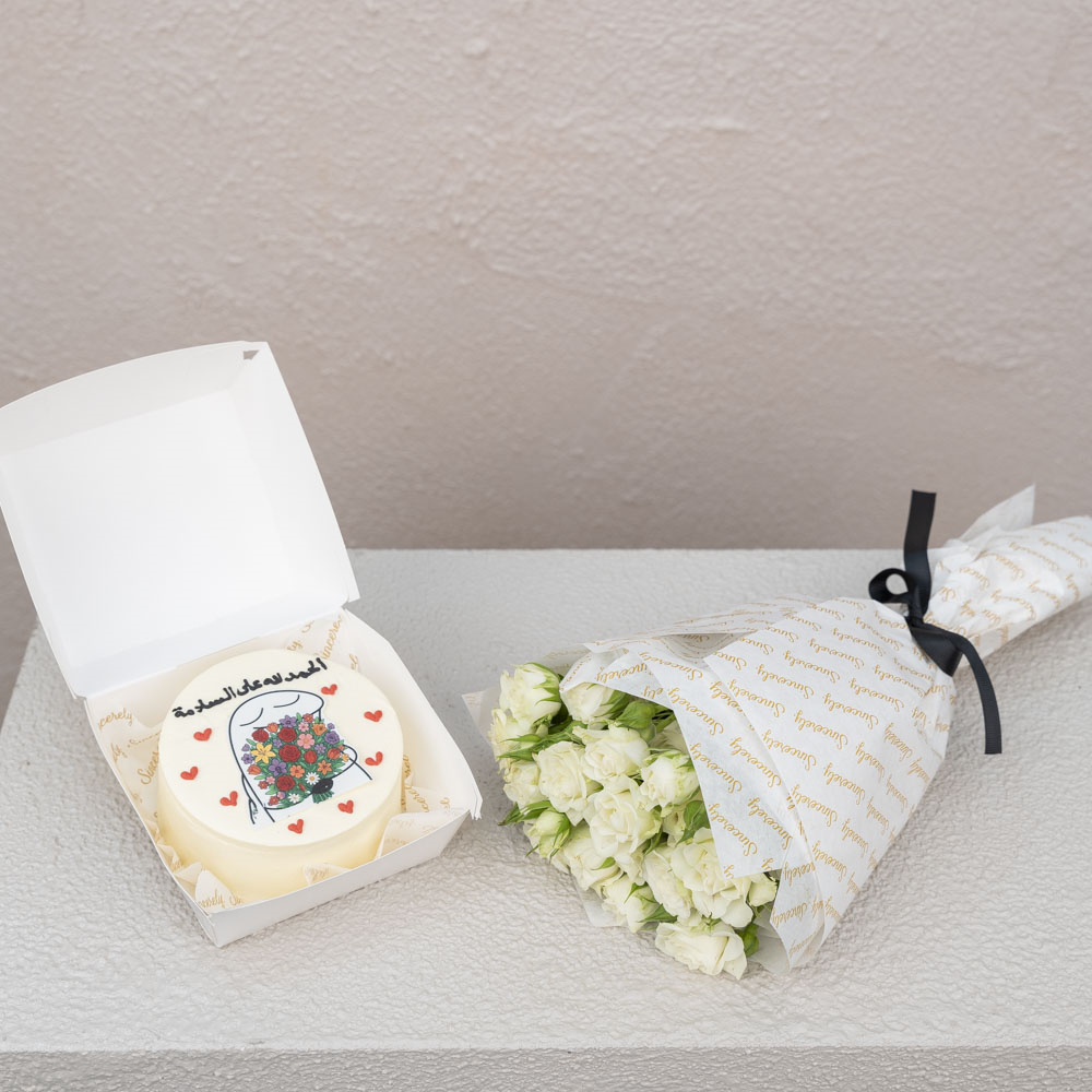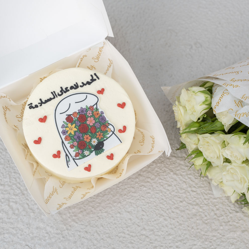 Yummy 4 inches bento lunch box chocolate cake for 2 persons served In a carton box with a small bouquet of baby roses.