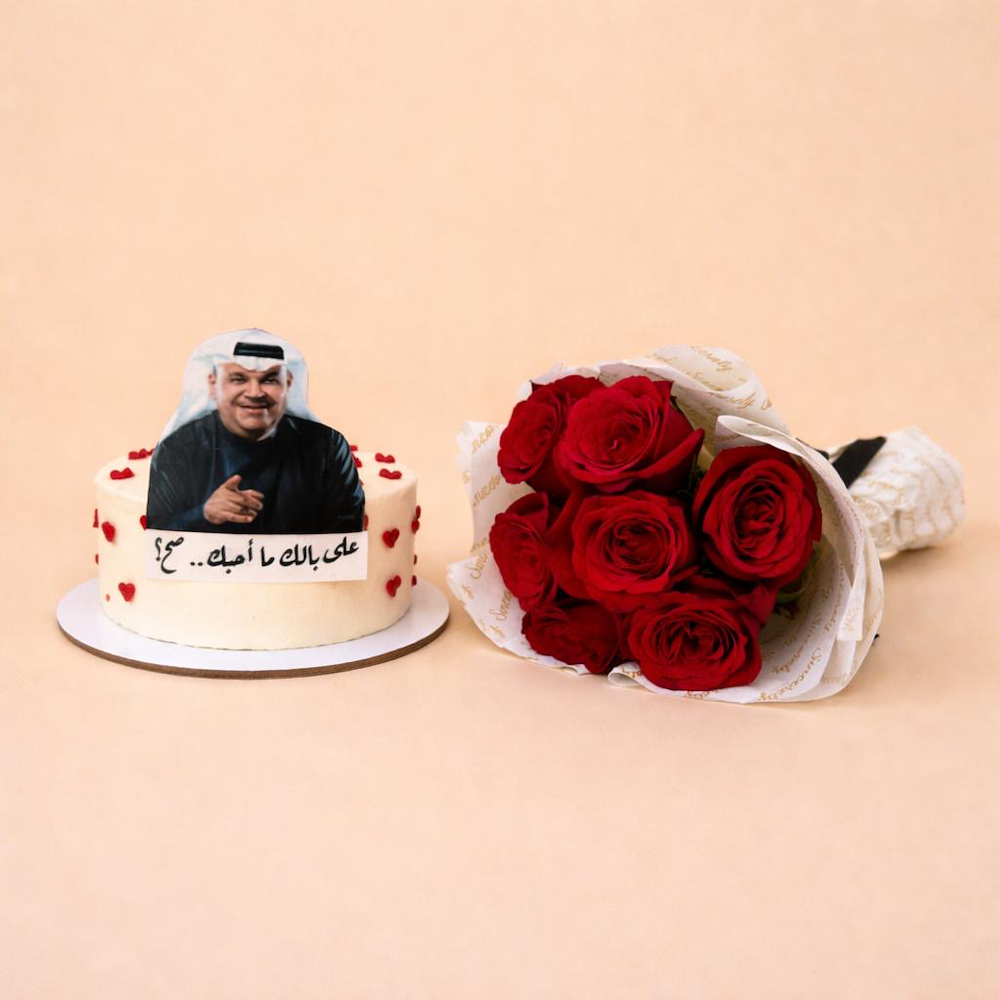 A 4 inches chocolate cake for 2 persons served on a board with red roses bouquet.