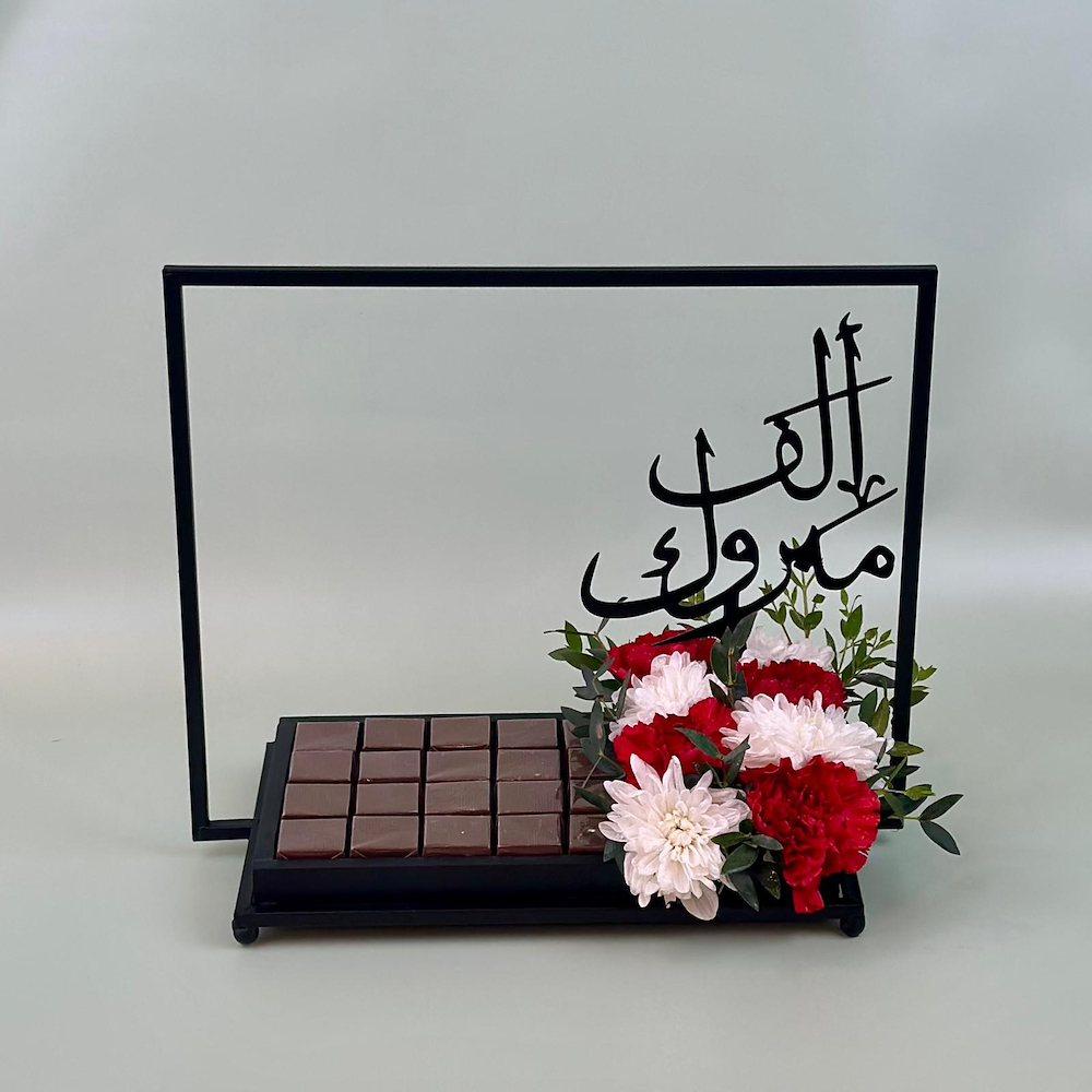 A tray filled with chocolates with carnation and chrysanthemum flowers.