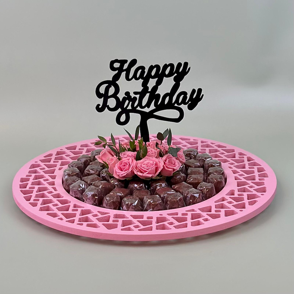 A tray filled luxurious Belgian chocolate, with baby roses.