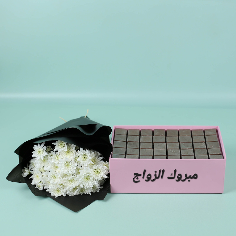 A set of chocolates in a pink box, comes with a hand bouquet of white chrysanthemum flowers and green leaves.
