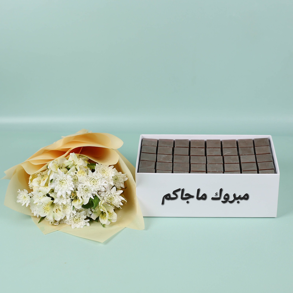A set of chocolates in a white box, comes with a hand bouquet of white alstroemeria and chrysanthemum flowers and green leaves.