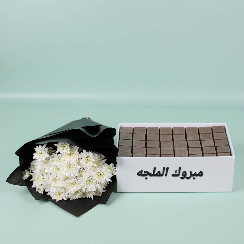 A set of chocolates in a white box, comes with a hand bouquet of white chrysanthemum flowers and green leaves.
