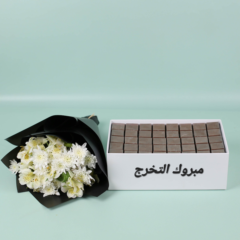 A set of chocolates in a white box, comes with a hand bouquet of white alstroemeria and chrysanthemum flowers and green leaves.