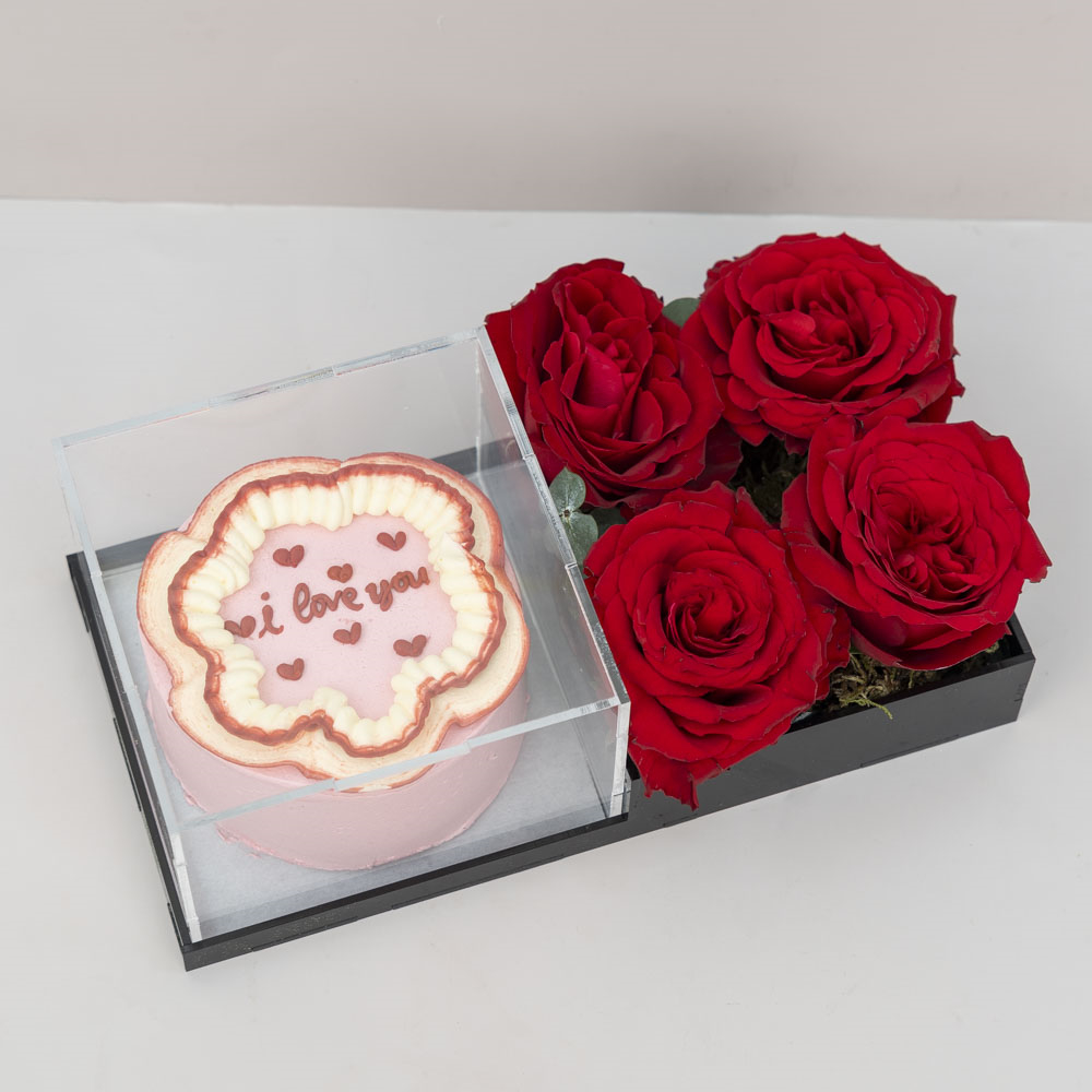 Yummy 4 inches bento lunch box chocolate flavor cake for 2 persons with 5 roses in acrylic box.