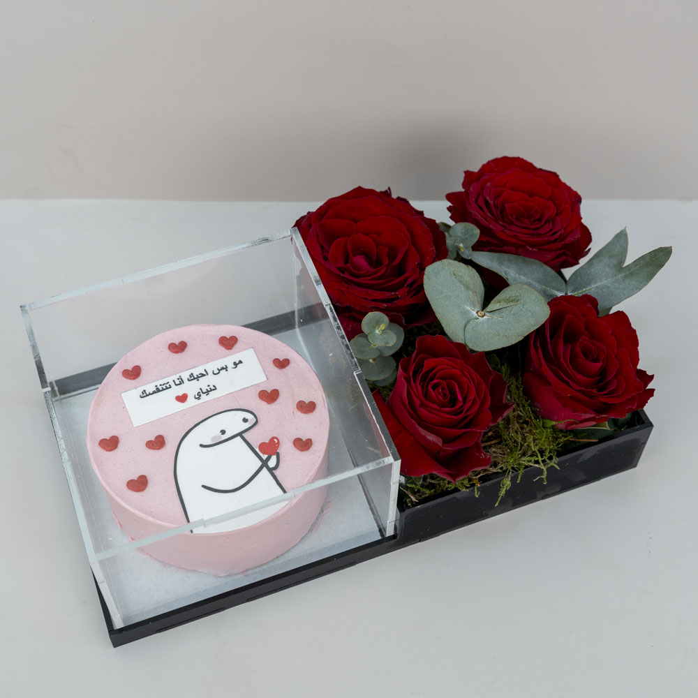 Yummy 4 inches bento lunch box chocolate flavor cake for 2 persons with 4 roses in acrylic box.