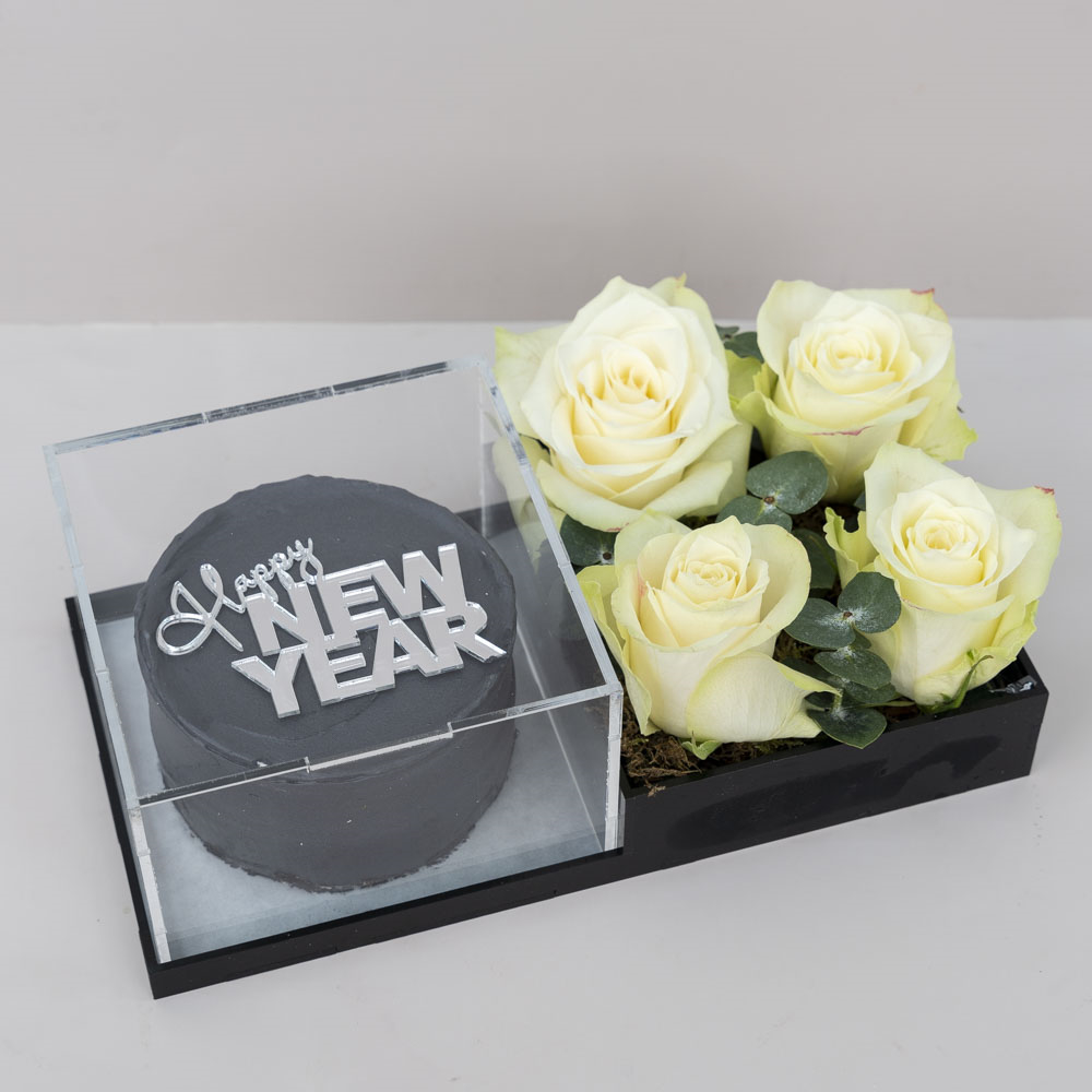 A 4 inch bento lunch box chocolate flavor cake for 2 persons with 4 roses in acrylic box.