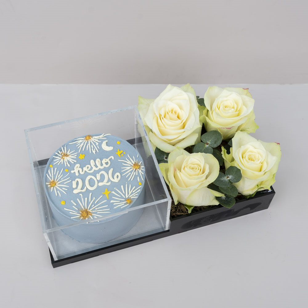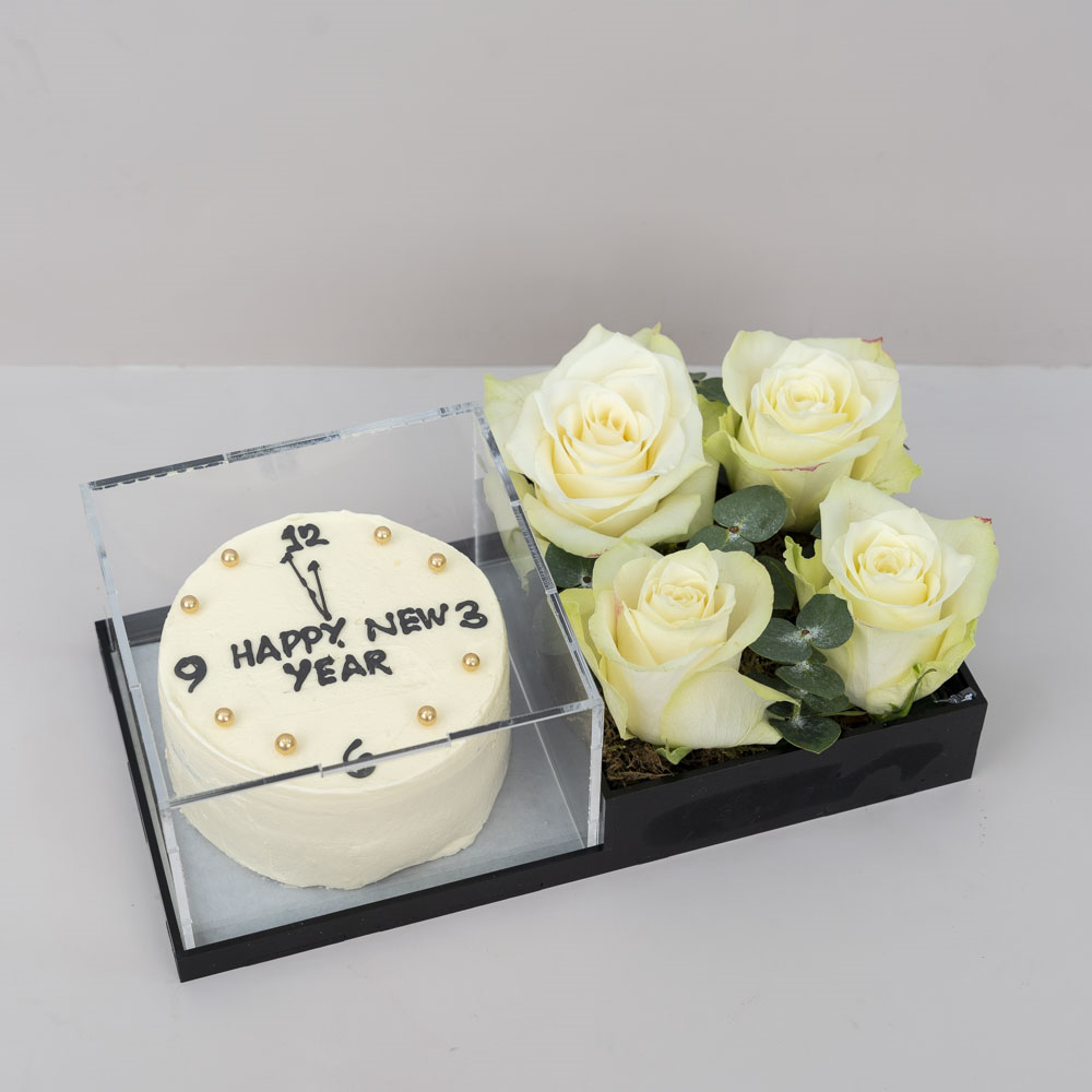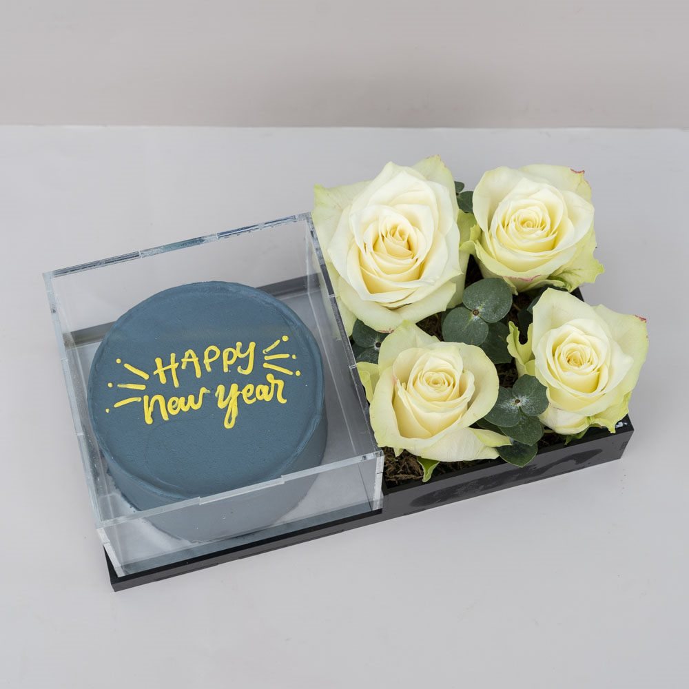 A 4 inch bento lunch box chocolate flavor cake for 2 persons with 4 roses in acrylic box.