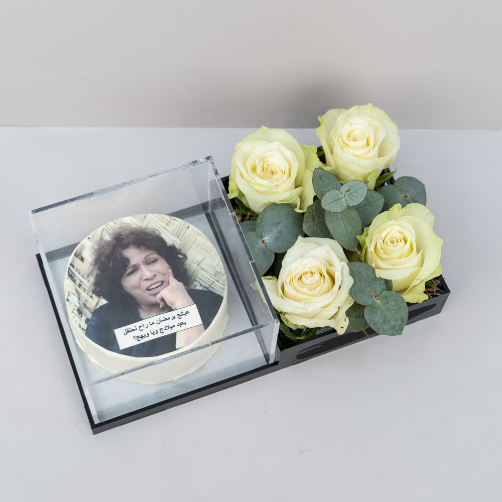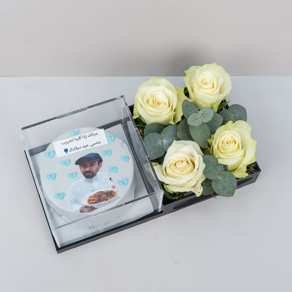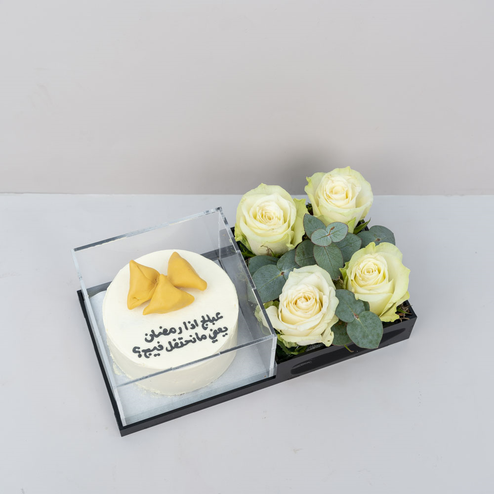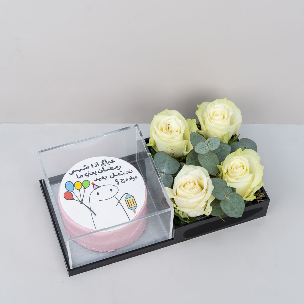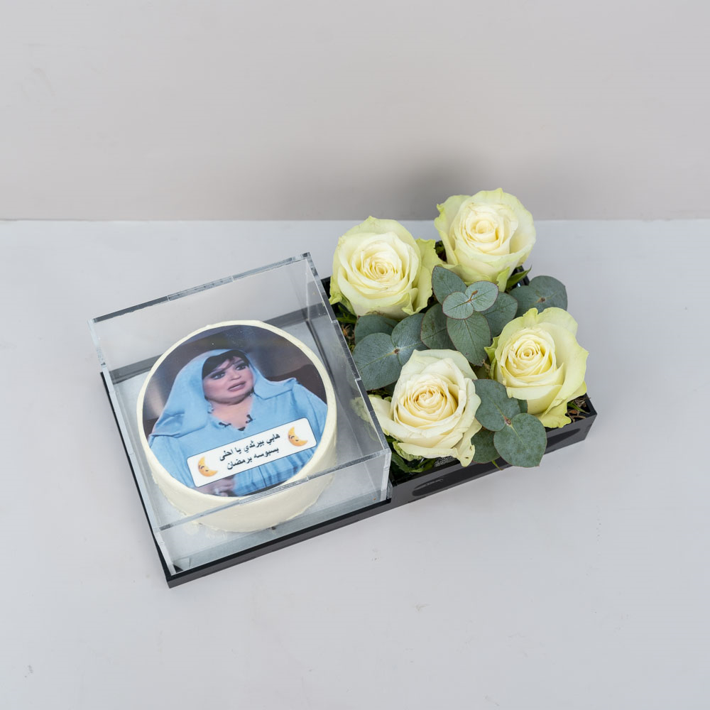 A 4-inch cake in a beautiful design, enough for 2 people. The flavors are chocolate, red velvet, or vanilla. Comes with roses.