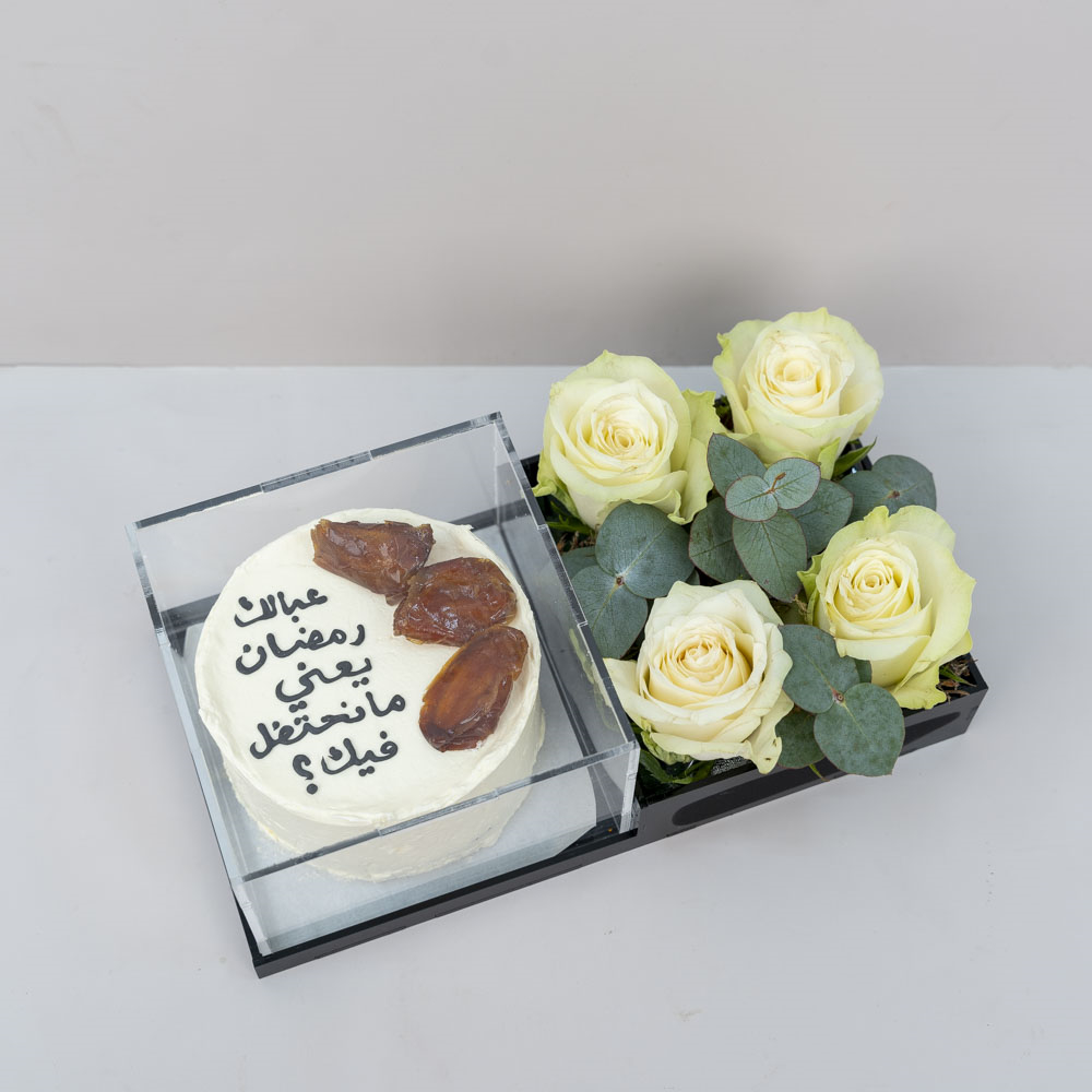 A 4-inch cake in a beautiful design, enough for 2 people. The flavors are chocolate, red velvet, or vanilla. Comes with roses.