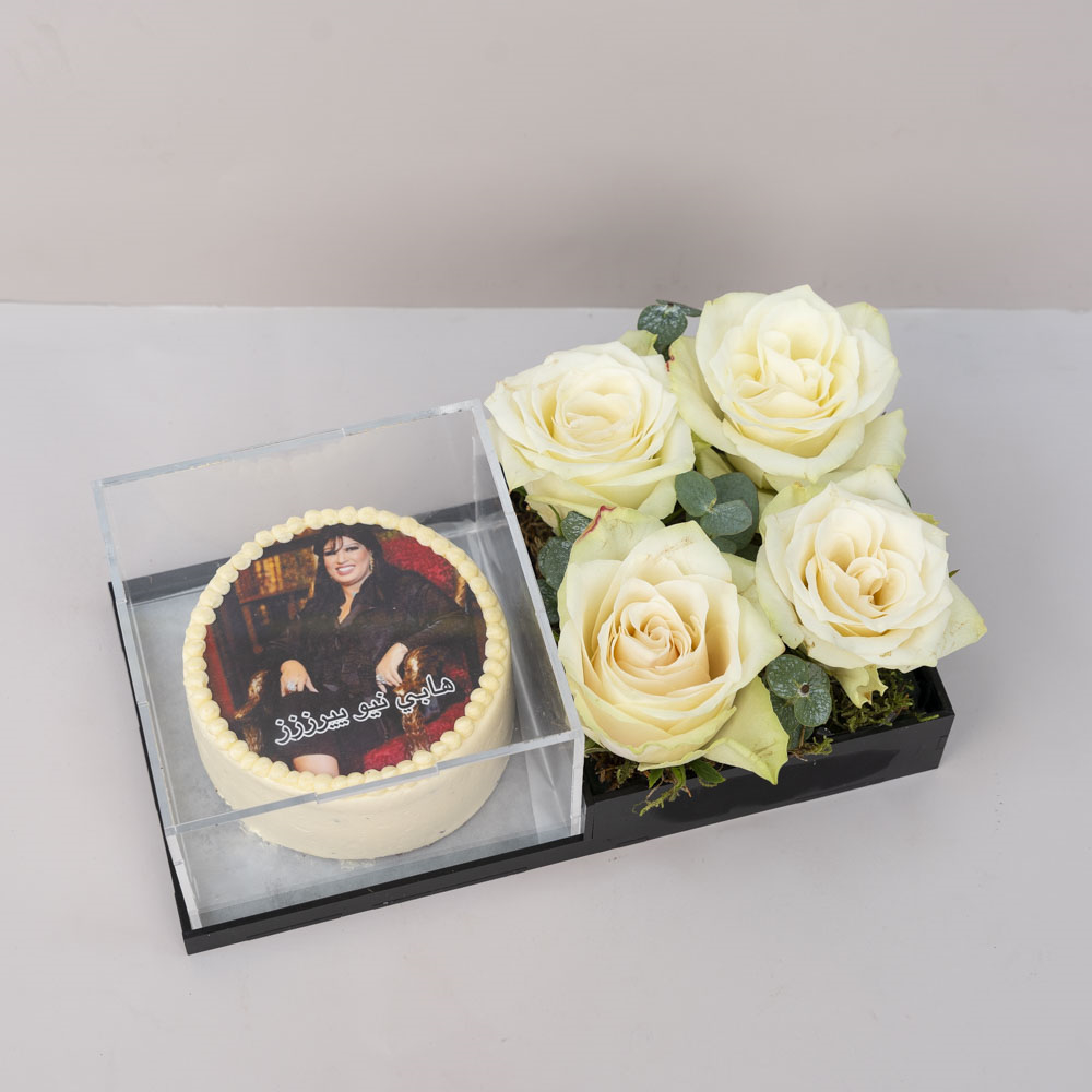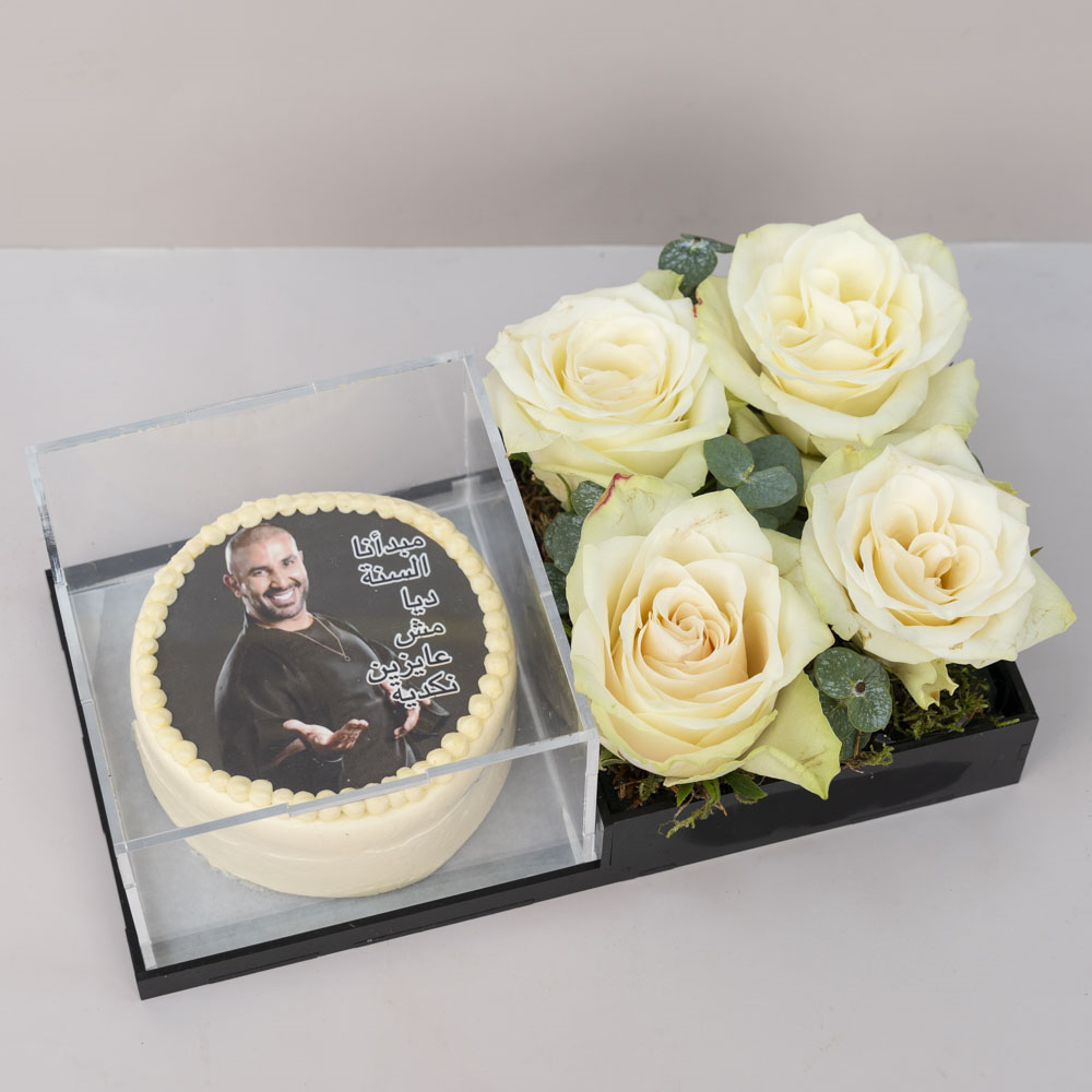 A 4-inch chocolate cake, enough for 2 people, arranged in an acrylic box with 4 white roses.