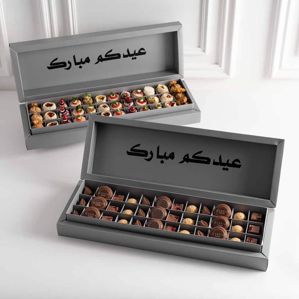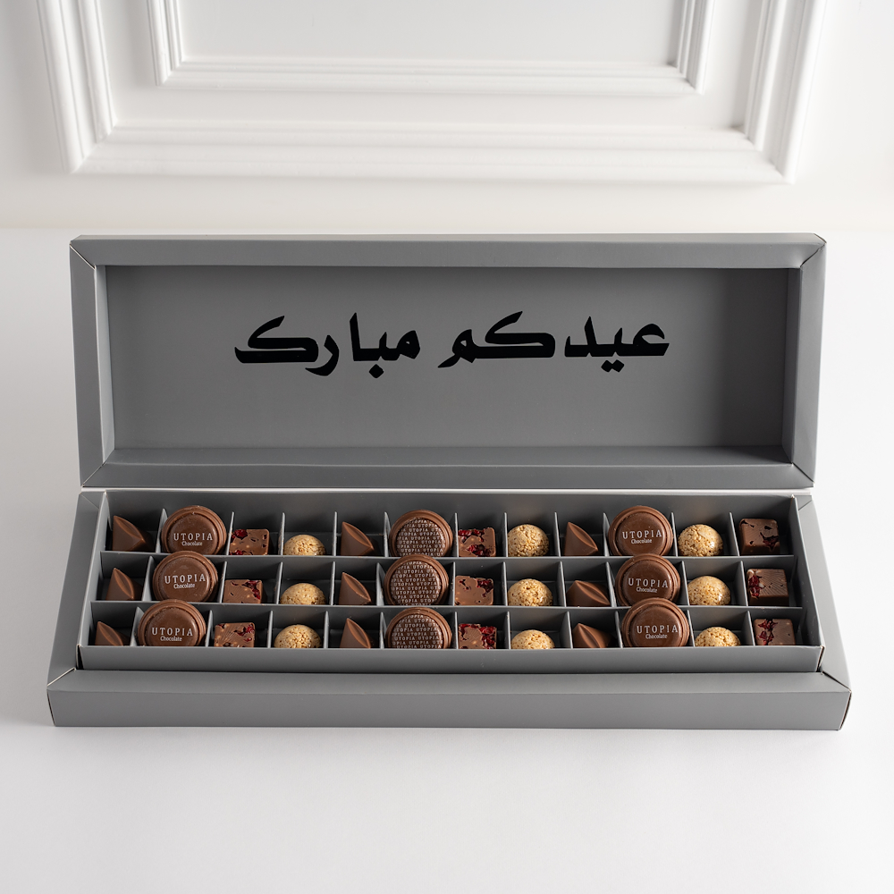 The Eid box contains chocolates filled with berries, pomegranate, sesame, Nutella, and caramel, decorated with the phrase "Eid Mubarak".
