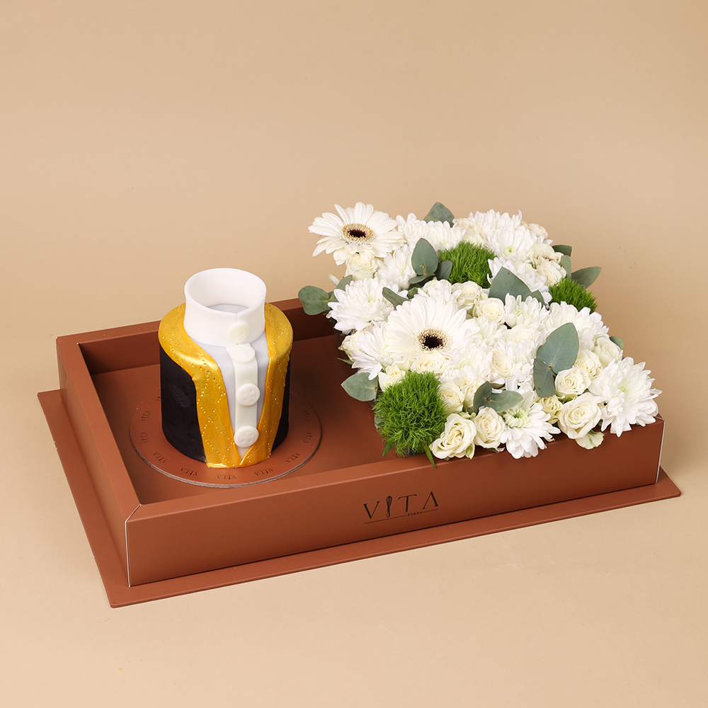 This box contains a chocolate cake with an arrangement of roses, baby roses, gerberas, chrysanthemums, and green leaves.
