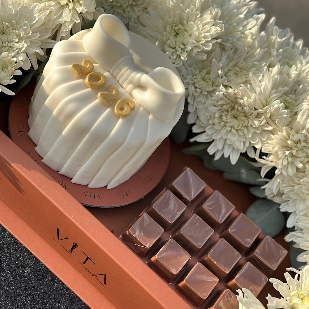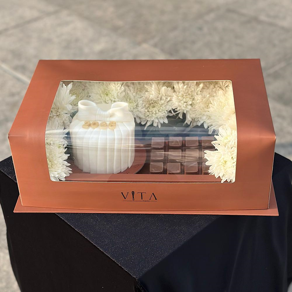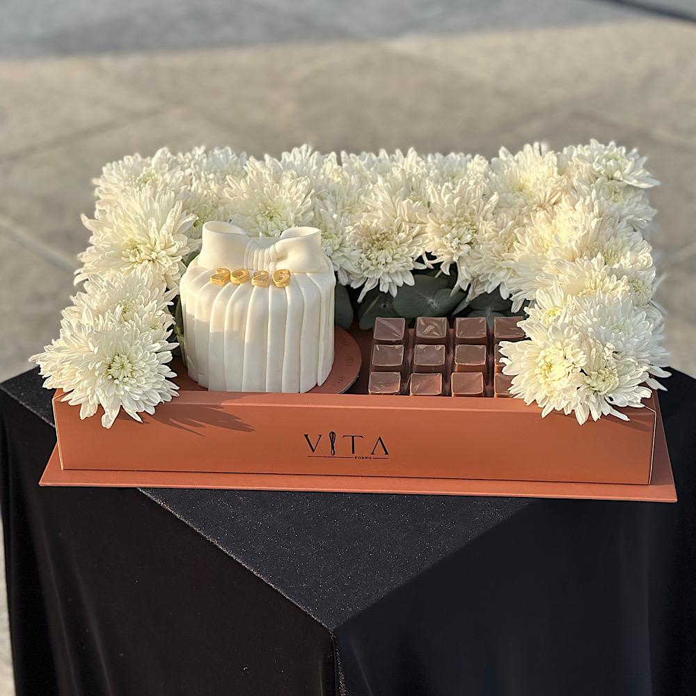 A box that contains white craize flowers and 12 pcs chocolates with a new year cake.