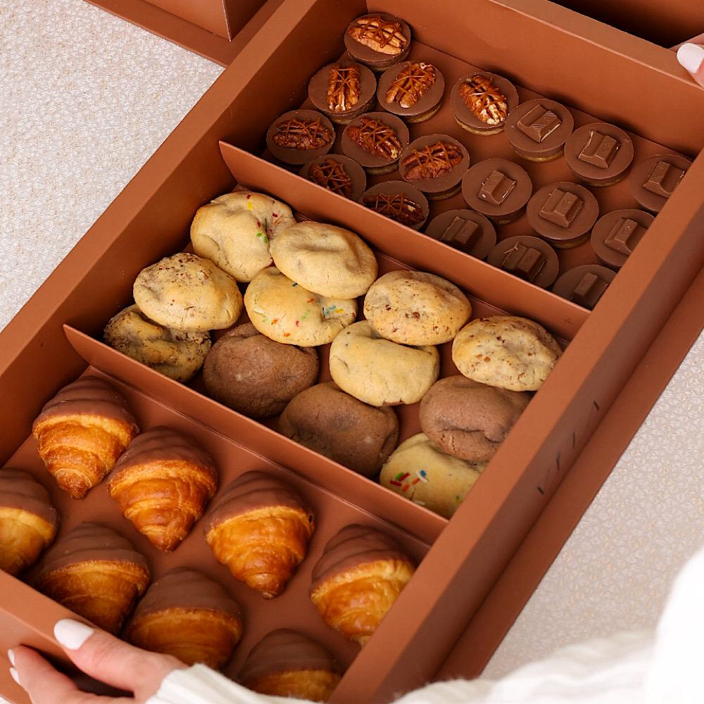 This box contains mini croissants, cookies, and kinder and pecan chocolate bites.