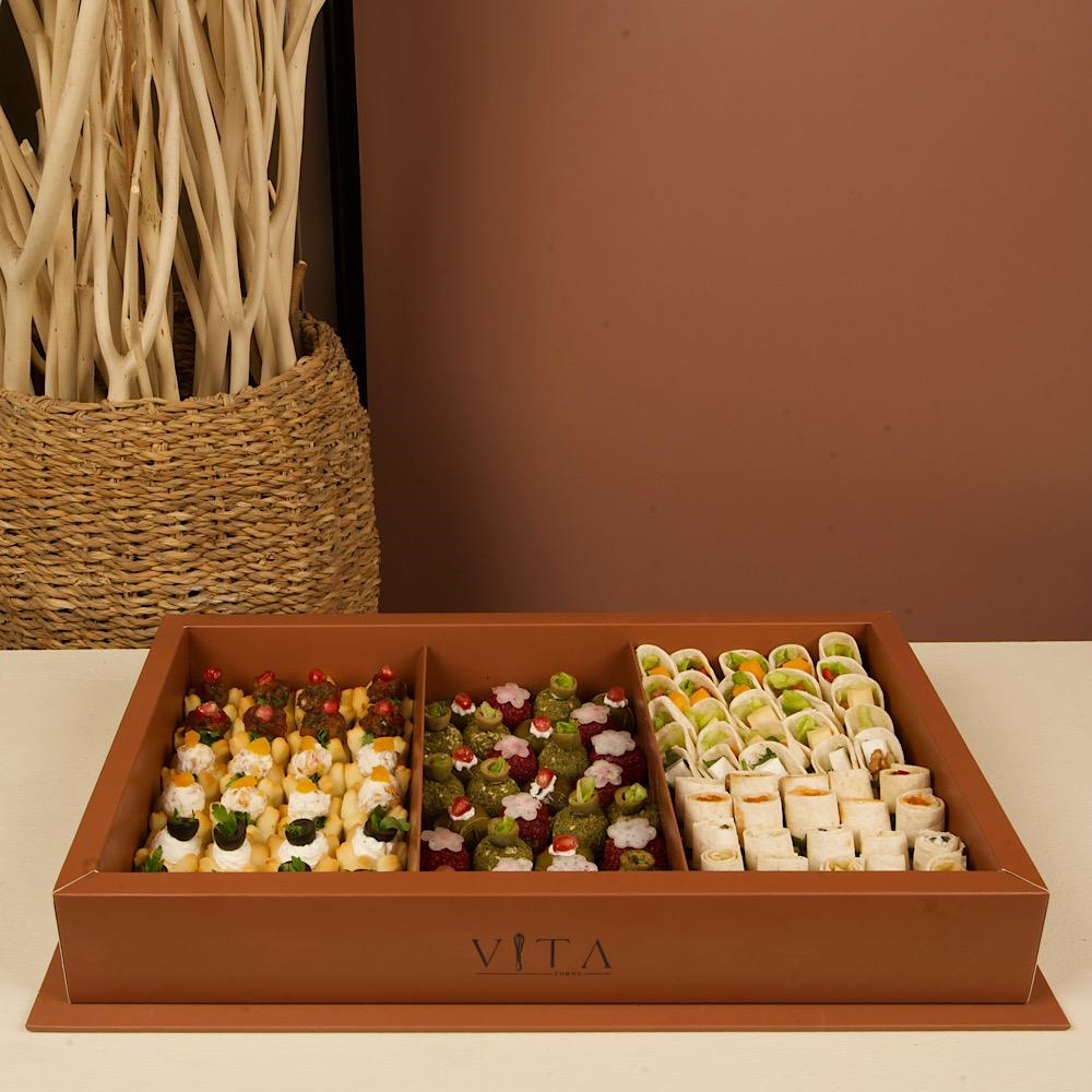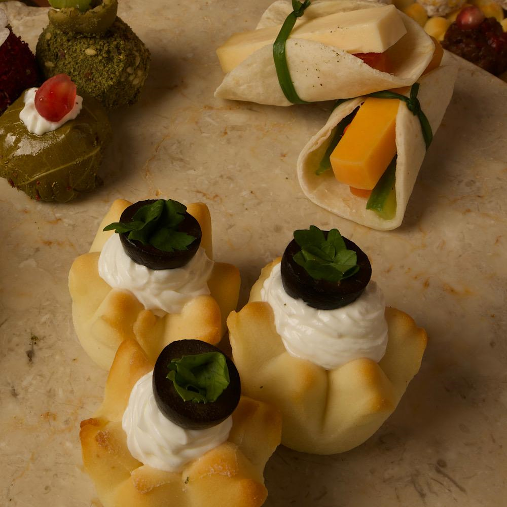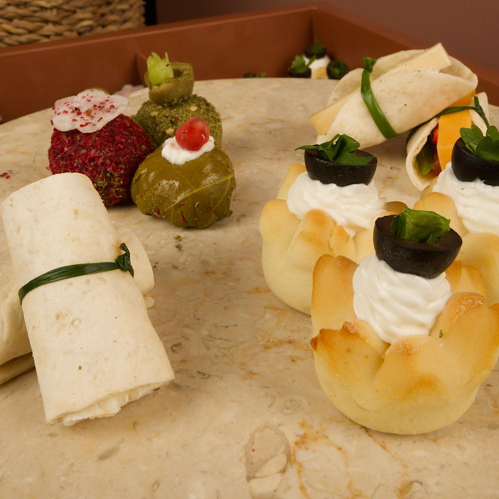 This box contains mini pastries with labneh, feta cheese, and eggplant, as well as sumac, zaatar, and pomegranate grape leaves. It also includes mini wraps with fillings of turkey, feta cheese, cheddar cheese, potato, eggplant, feta with olives, and halloumi.