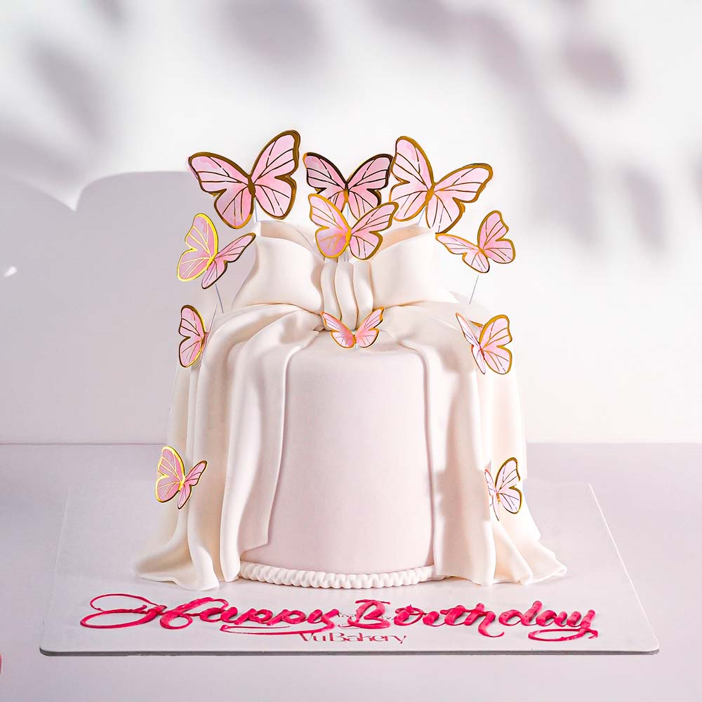 A luxurious fondant-covered cake in elegant pearly white, featuring a sculpted fondant bow and delicate butterflies, comes in chocolate, or vanilla or red velvet flavor.