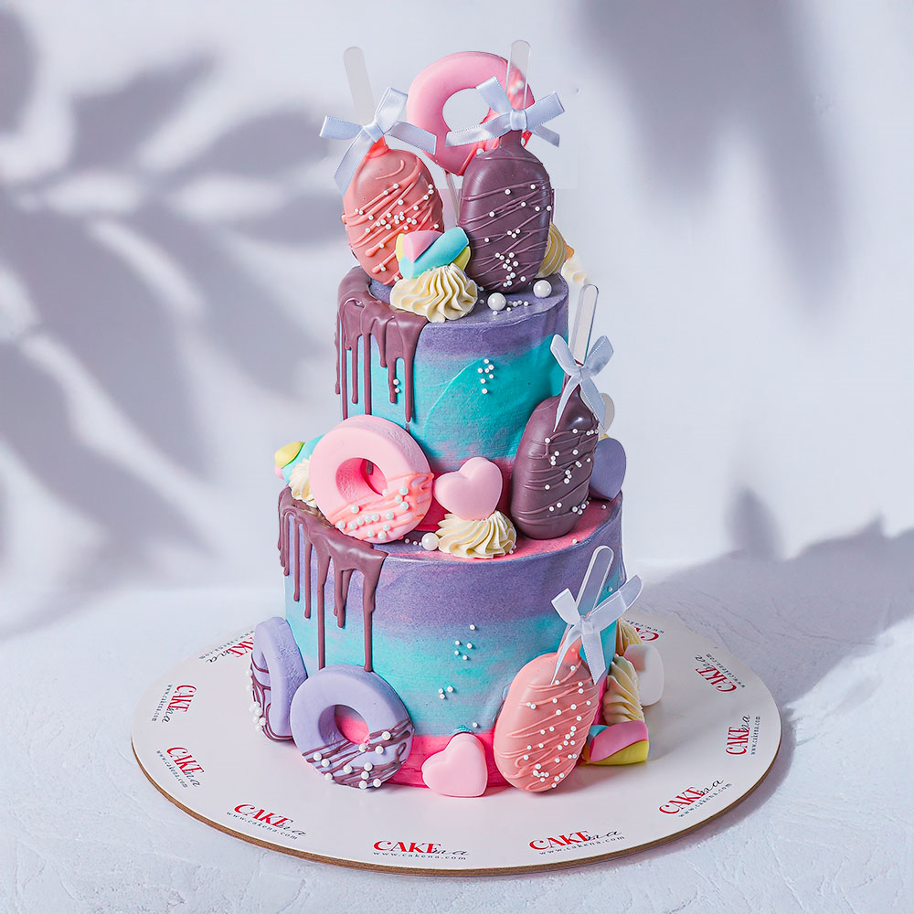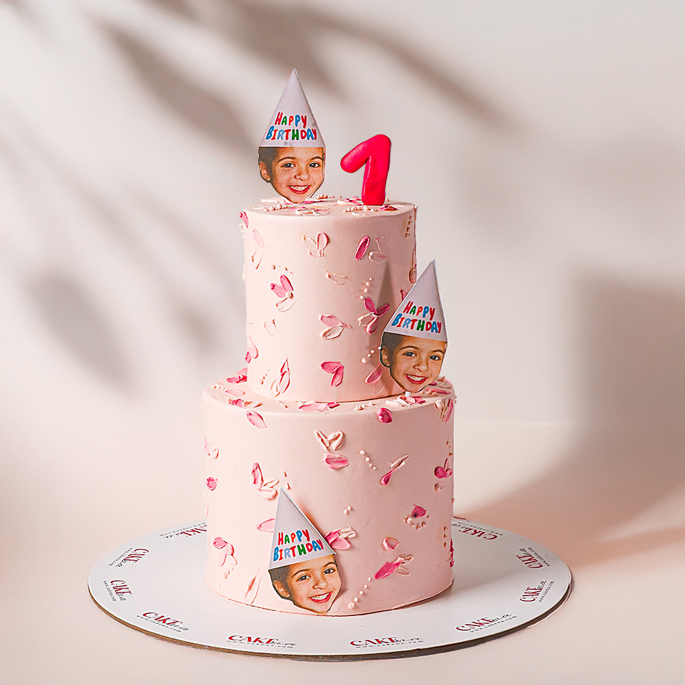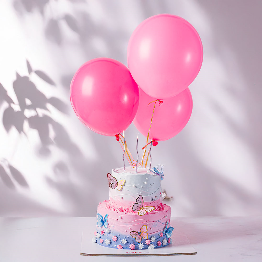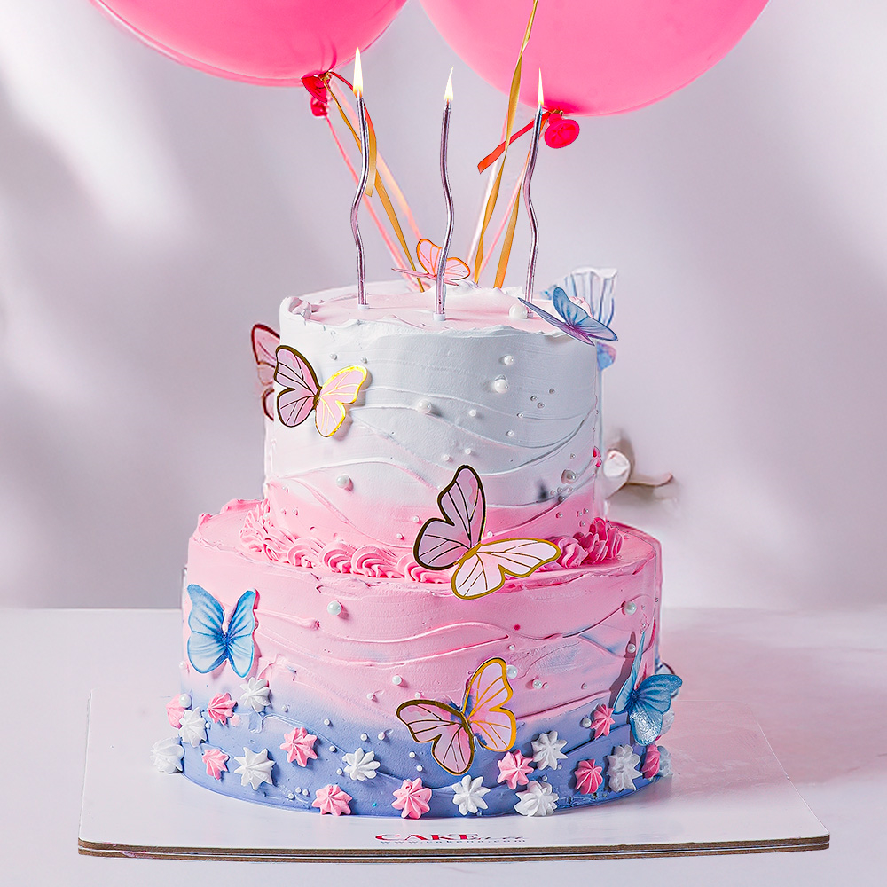 A two tier cake 6 and 4 inch serving 8 to 12 persons in pink and blue ombre tones decorated with edible butterflies pearl like cream dots slim candles and pink balloons available in chocolate vanilla or red velvet upon request.