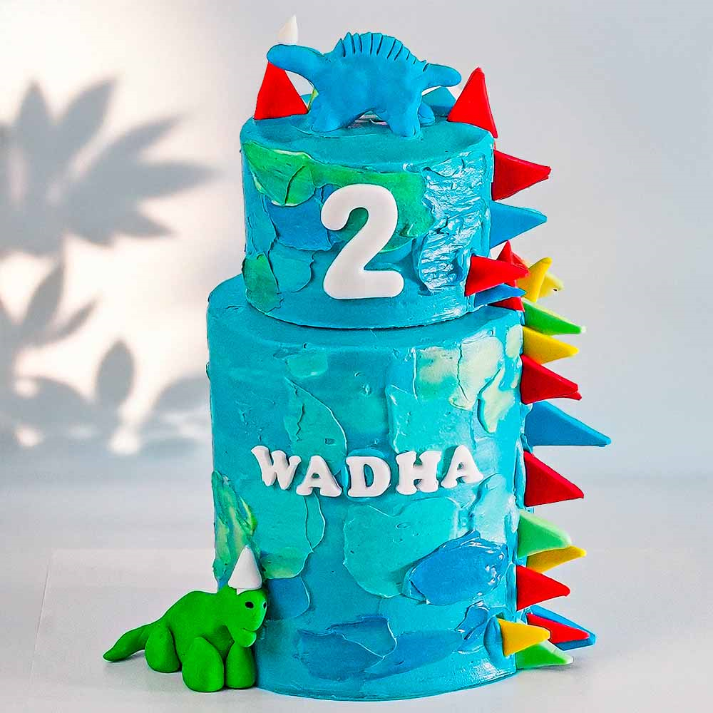 A lively 2-layer dinosaur cake in bright sky-blue shades, decorated with colorful spikes in red, yellow, and green. Topped with a white number to mark the age and a cute little dinosaur figure at the base. The flavors are chocolate, red velvet, and vanilla.