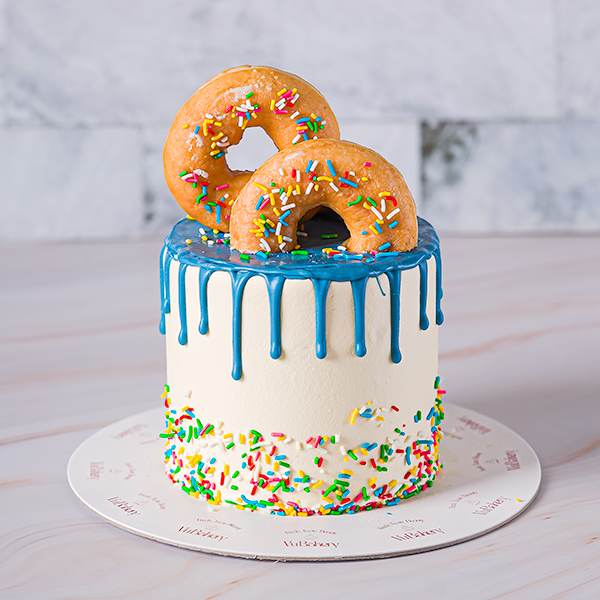 5 inch cream cake topped with doughnuts.