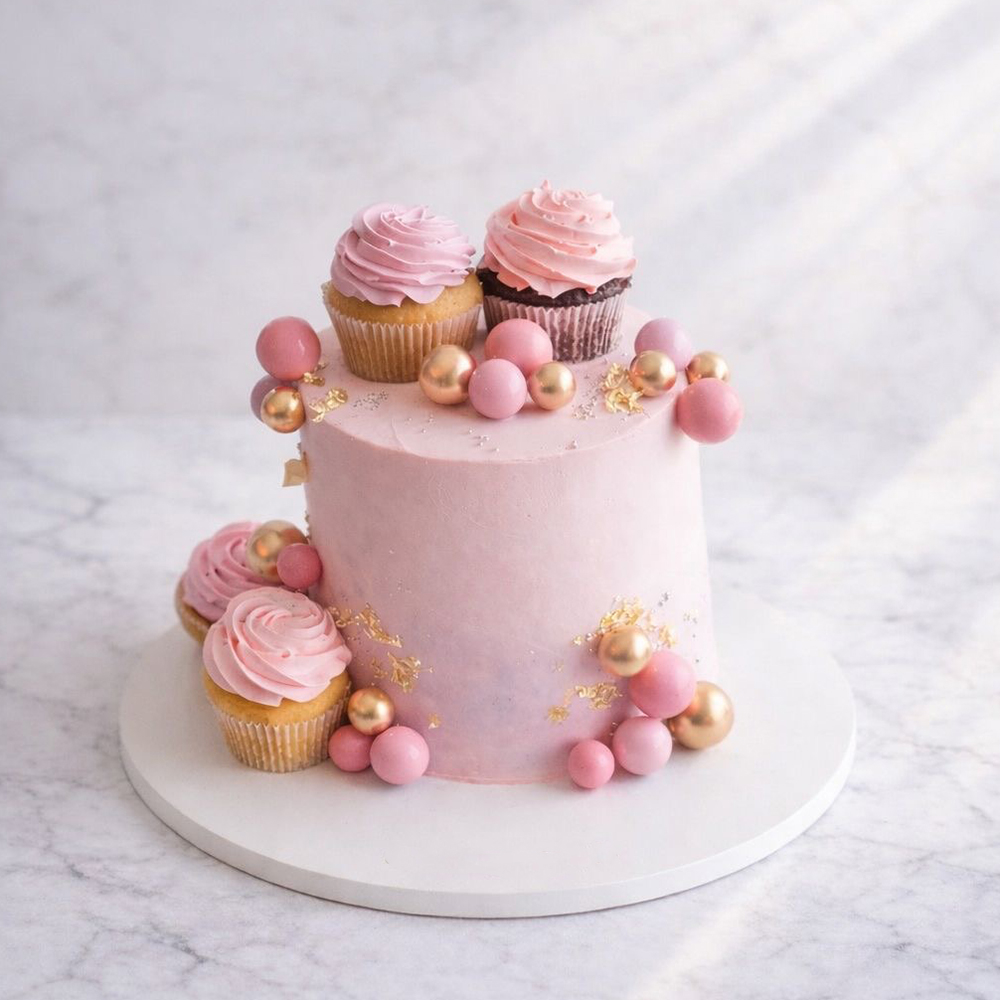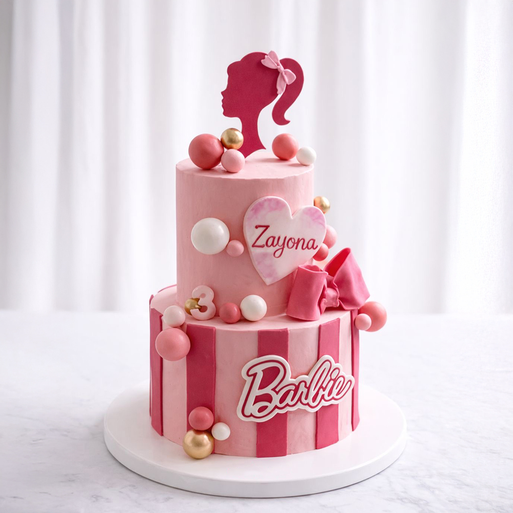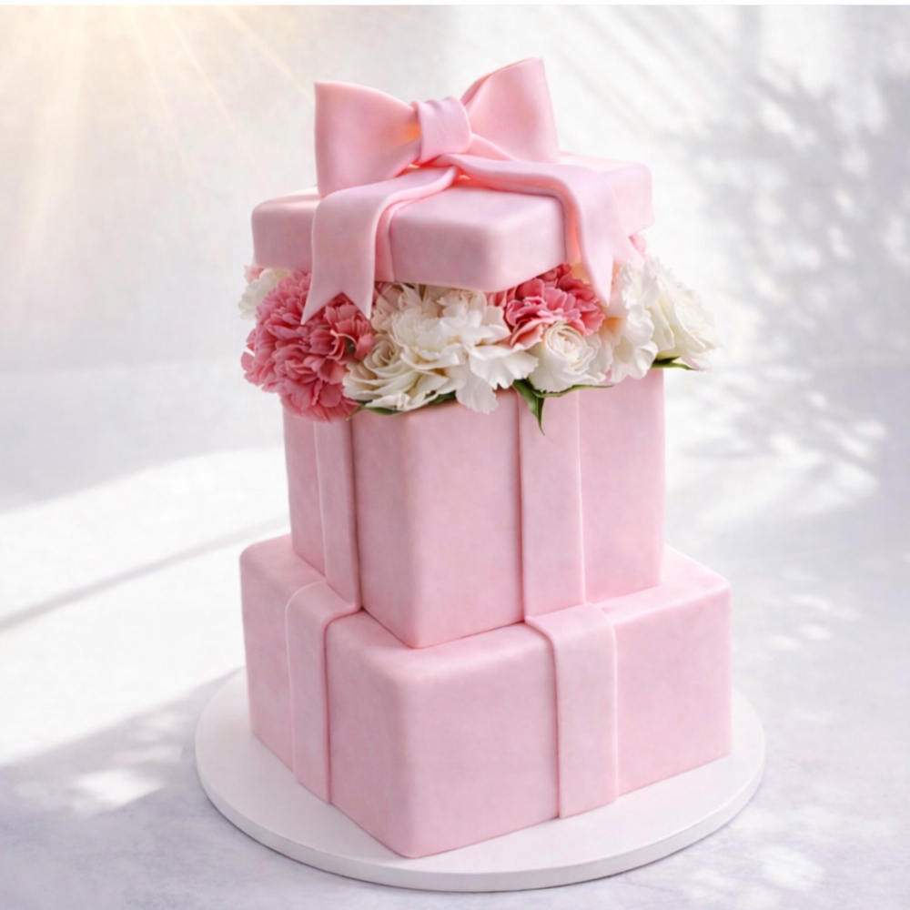 A two-tier cake (6 & 5 inch) in a soft pink gift box style, serving 10–14 people. Elegant and minimal, designed like a luxury present perfect for special celebrations.