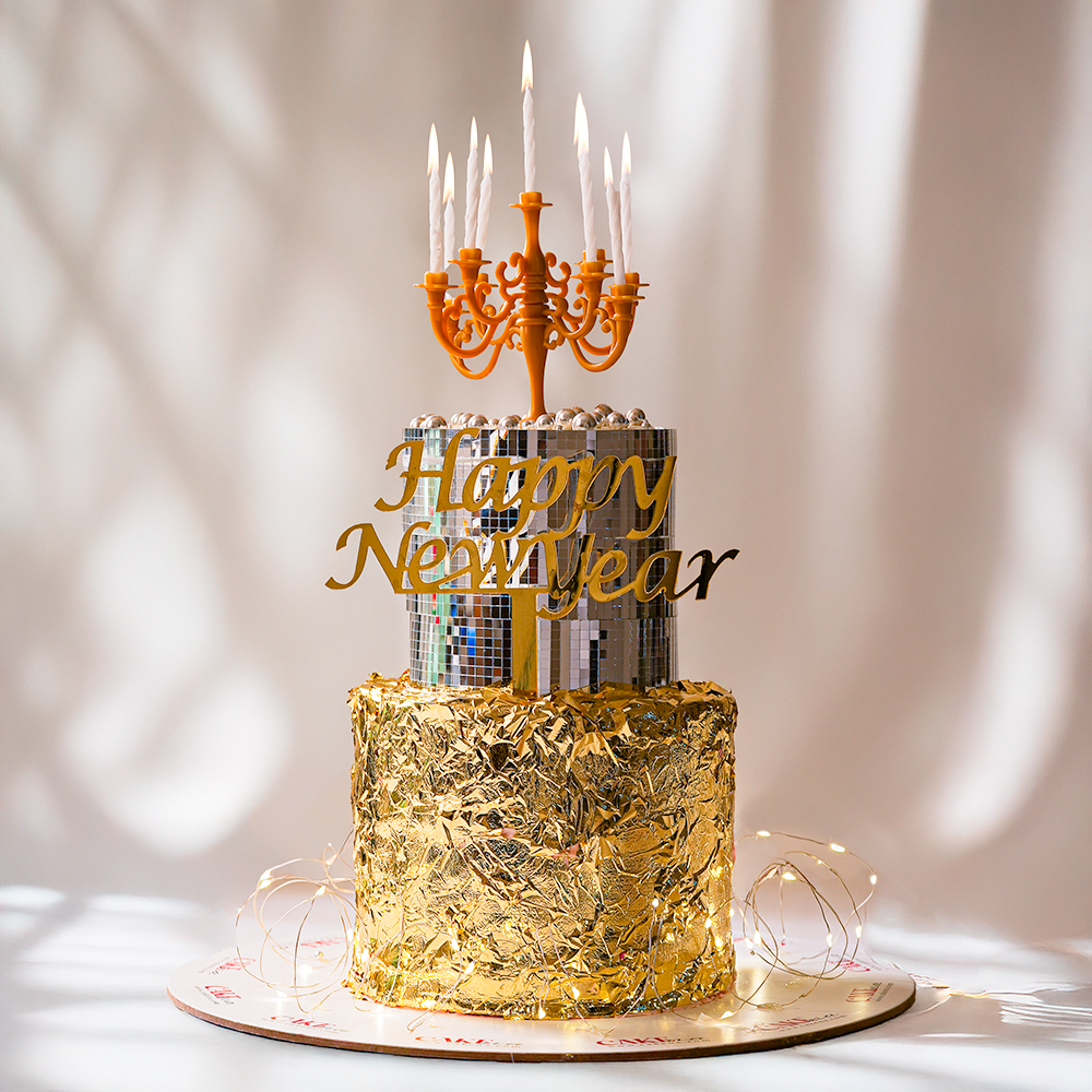 A stylish two-tier cylindrical cake featuring a crinkled gold-foil base and a reflective upper tier for a bold, modern look. Decorated with a gold Happy New Year topper, an elegant decorative chandelier, and wrapped LED fairy lights that add a warm festive glow and elevate the overall presentation. Flavor: Chocolate, Vanilla, or Red Velvet (upon request). Occasion: New Year celebrations and upscale gatherings
