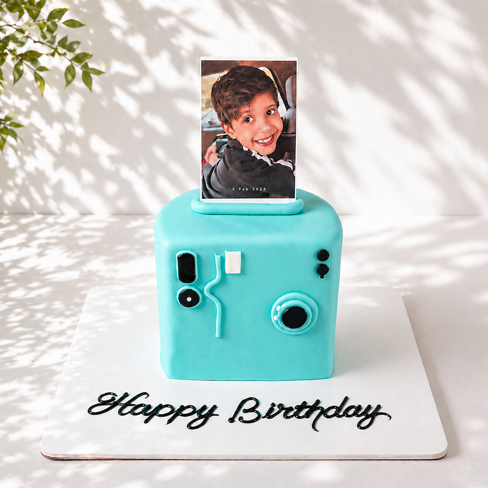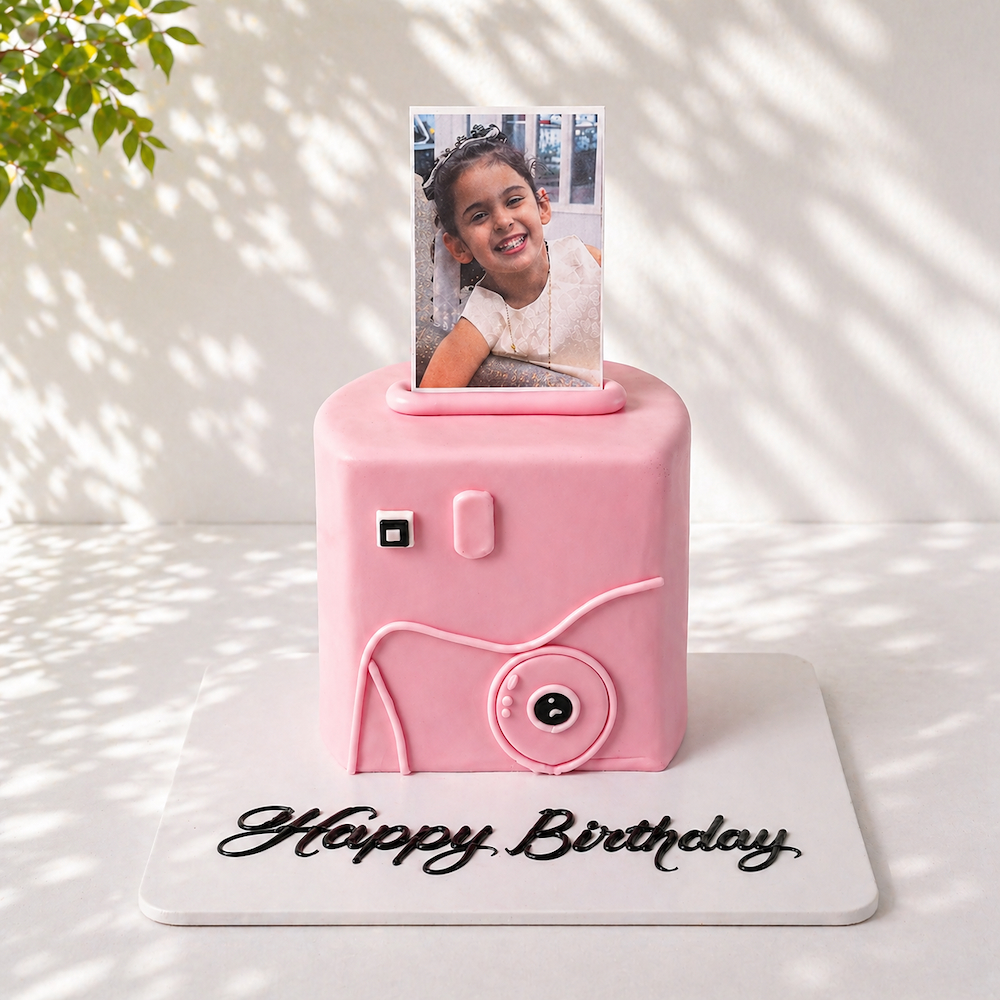 A 5-inch pink camera-themed cake with a custom photo, serving 5–7 people. A soft and stylish design with a personal touch.