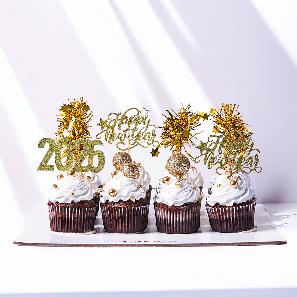 A set of 12 festive cupcakes topped with smooth white cream and elegant gold accents. Each cupcake is decorated with Happy New Year and 2026 toppers, creating a joyful and stylish celebration look. Perfect for parties, gifting, and welcoming the new year. Flavor: Chocolate, Vanilla, or Red Velvet (upon request). Occasion: New Year celebrations, gifts, and gatherings