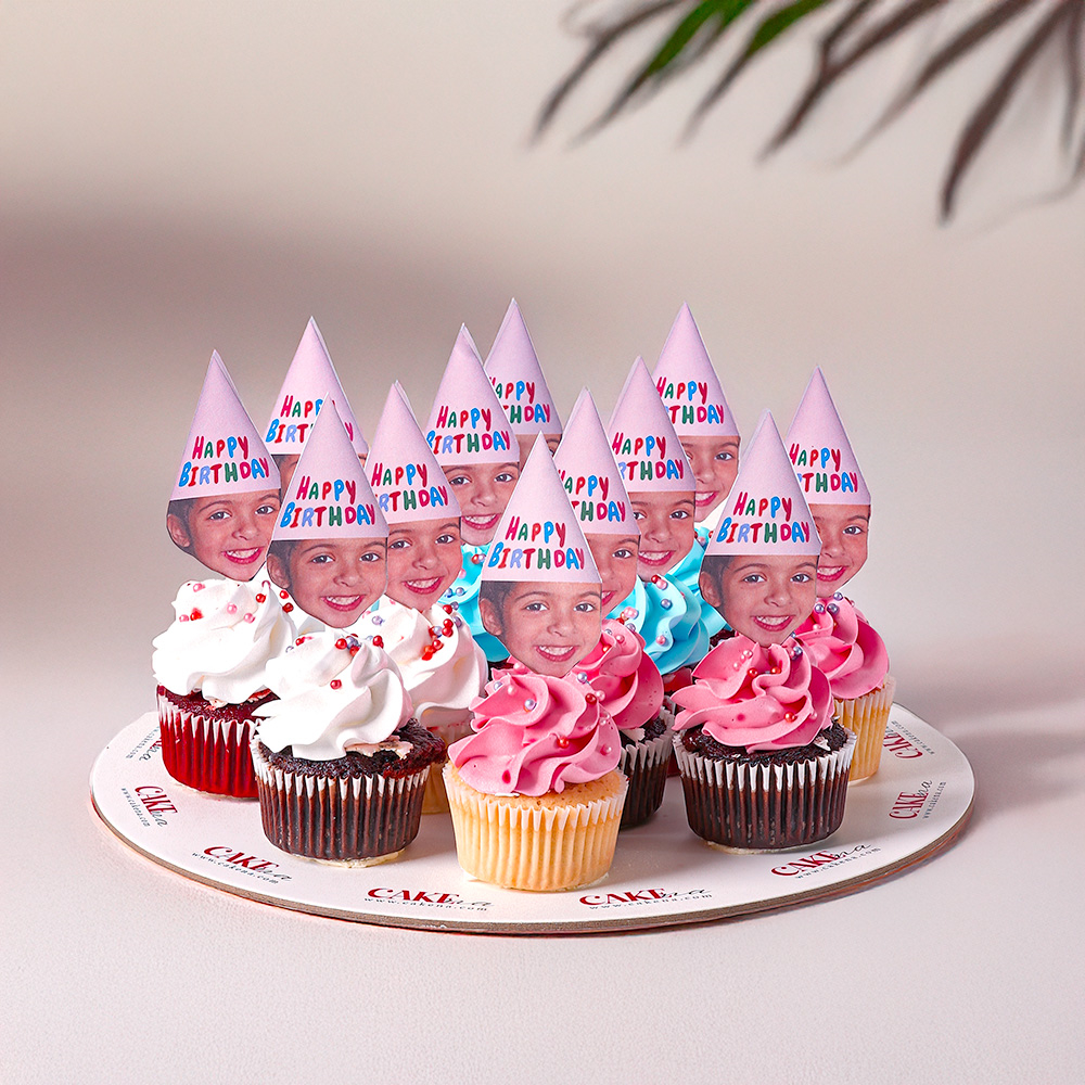 A set of 12 cupcakes in mixed flavors chocolate, vanilla, and red velvet topped with colorful buttercream swirls in pink, white, and blue with customized picture toppers.