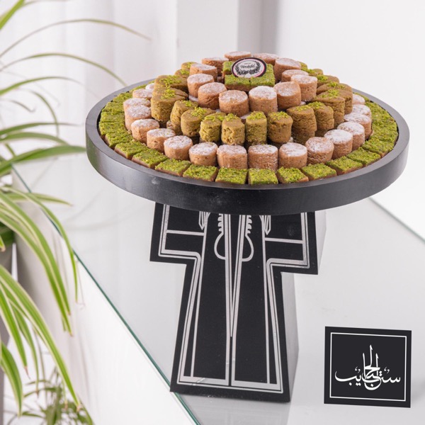 Large wooden kaftan shaped stand with approx.1.5 kg assortment of Kuwaiti Sweets gorayba, pistachio gorayba, rangena, with "sit alhabayeb card".