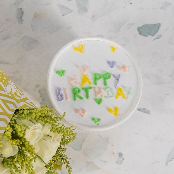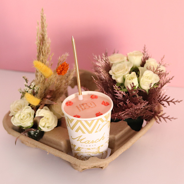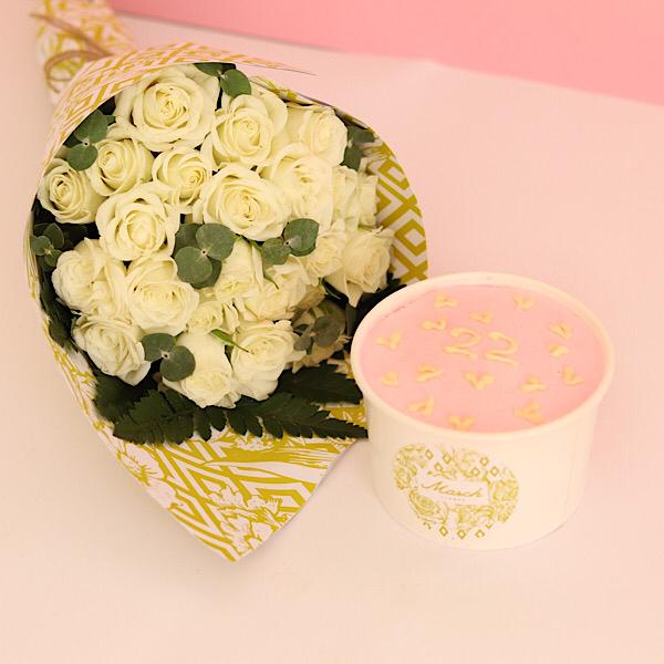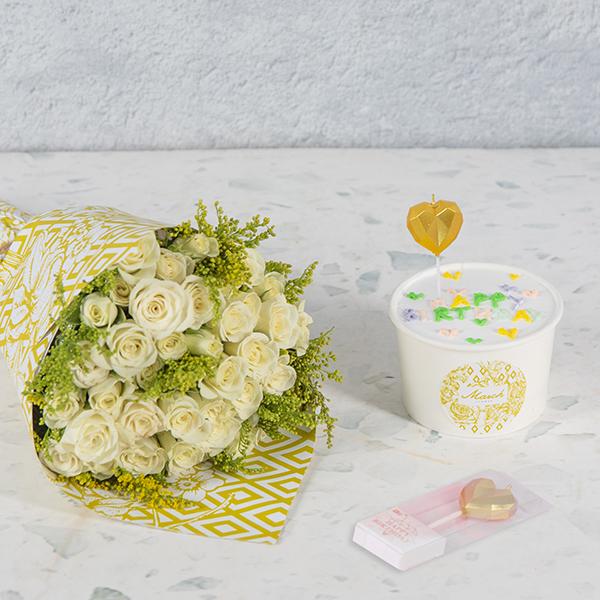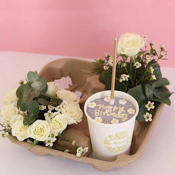 This hand bouquet contains white baby roses and solidago flowers with a cake in a cup and a candle.