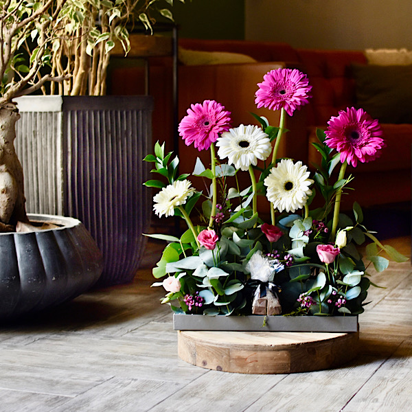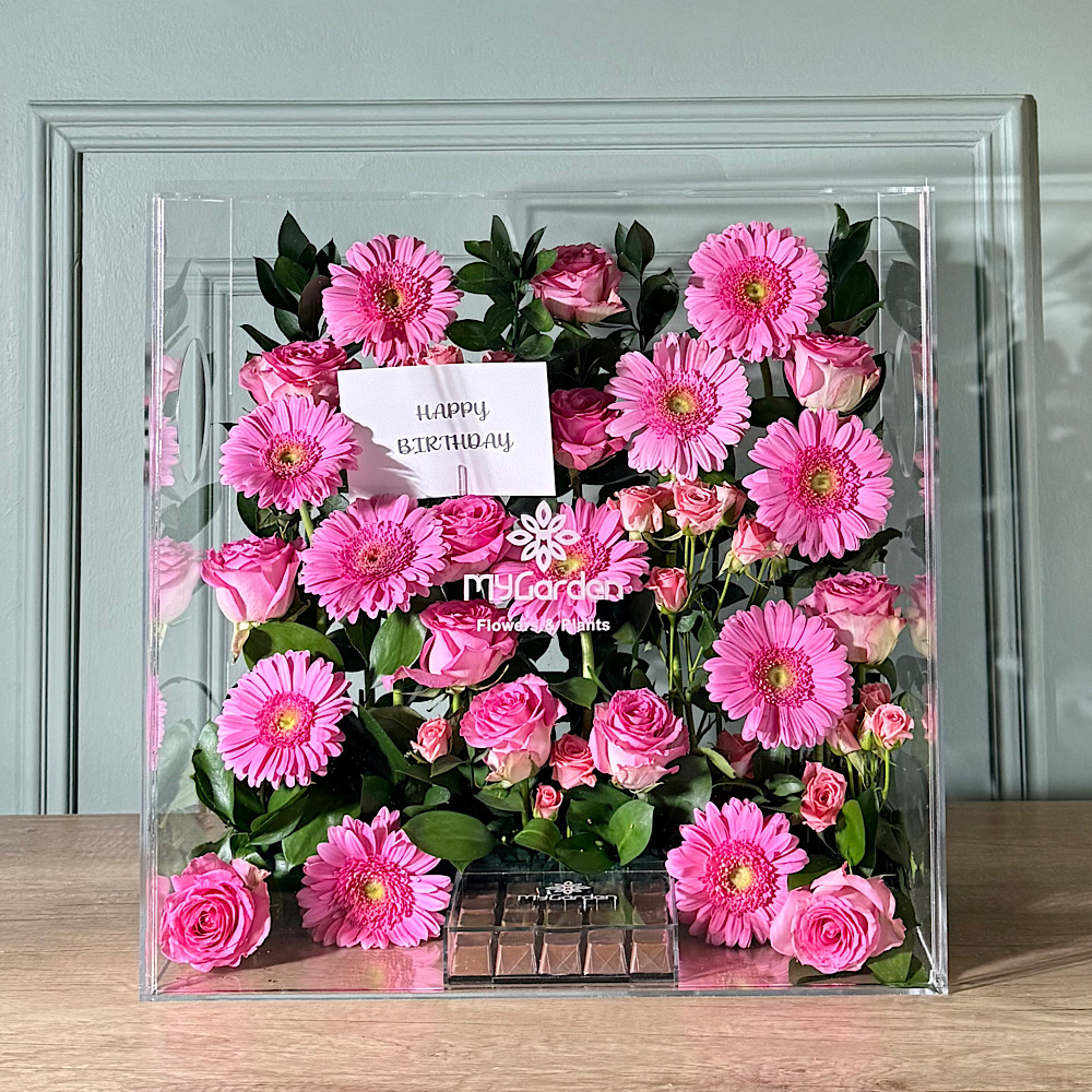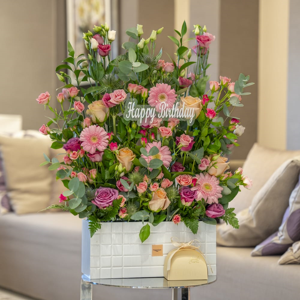 The bouquet contains Daisy flower and Lishanton flower with chocolates.