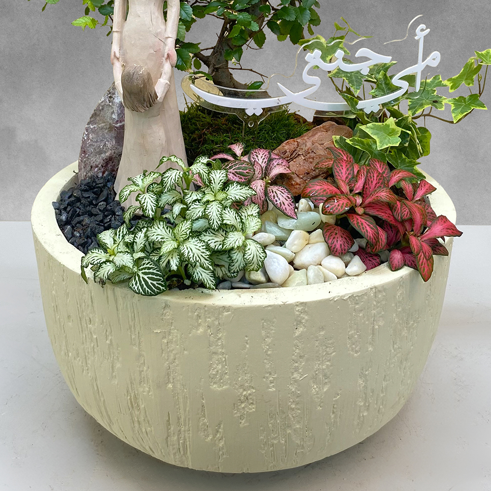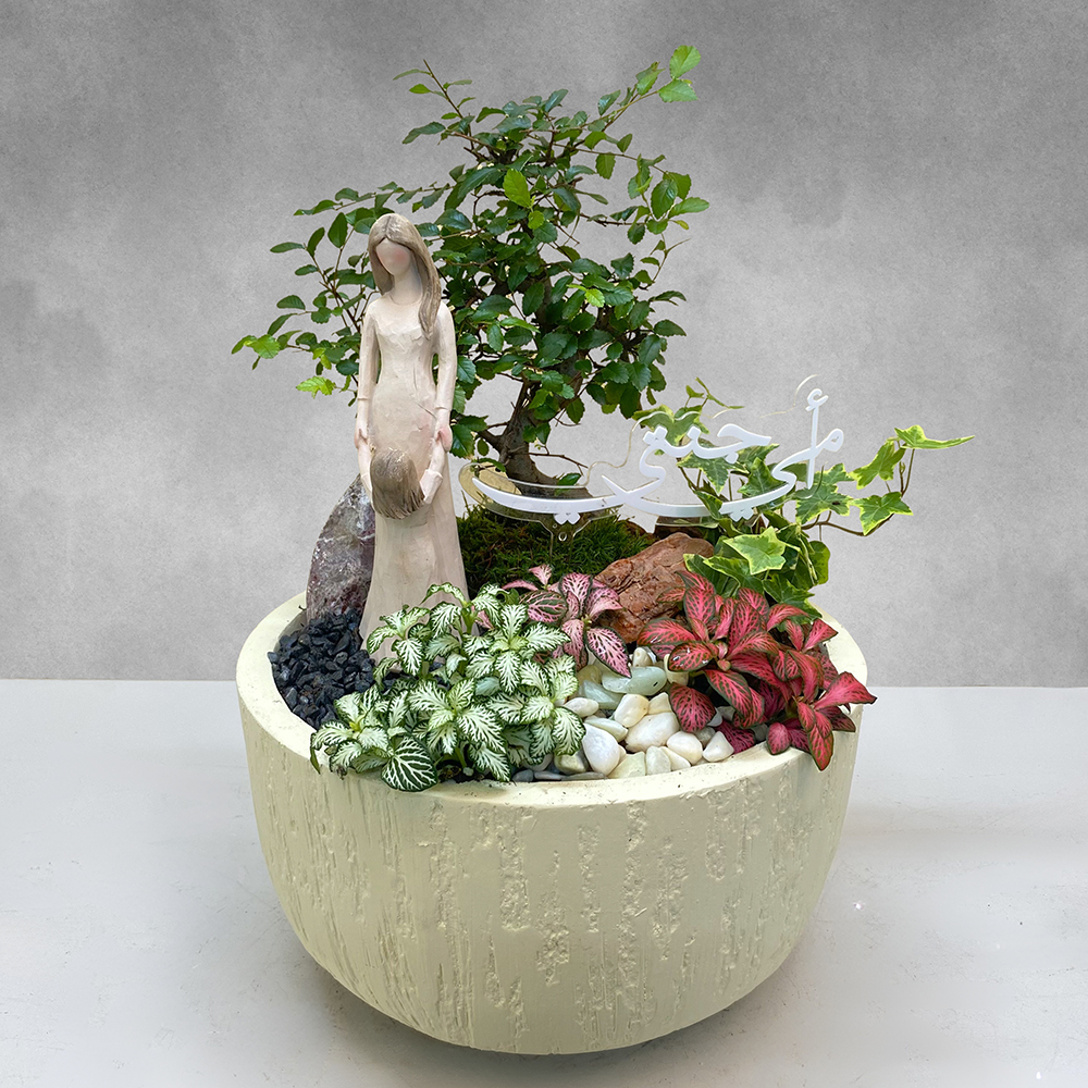Beige pot with zelkova bonsai, nerve plants and ivy with a figurine.