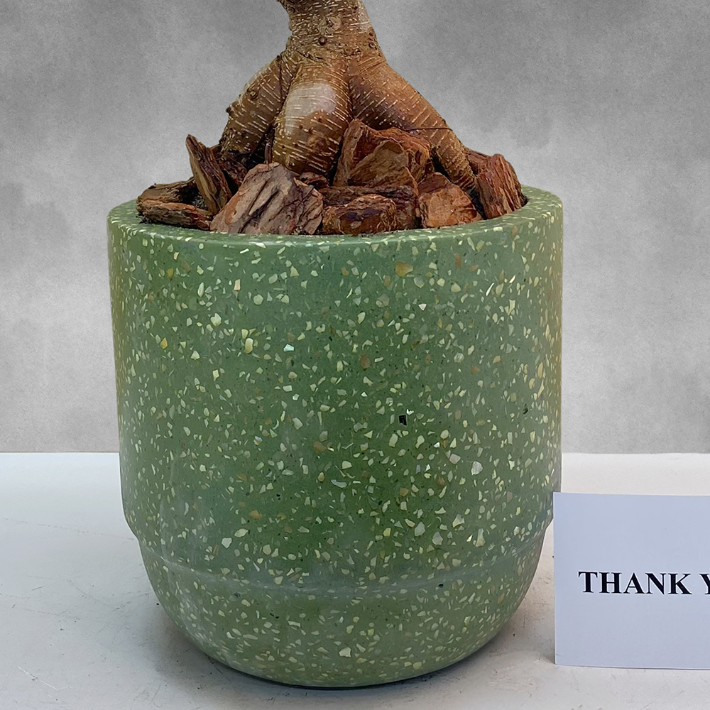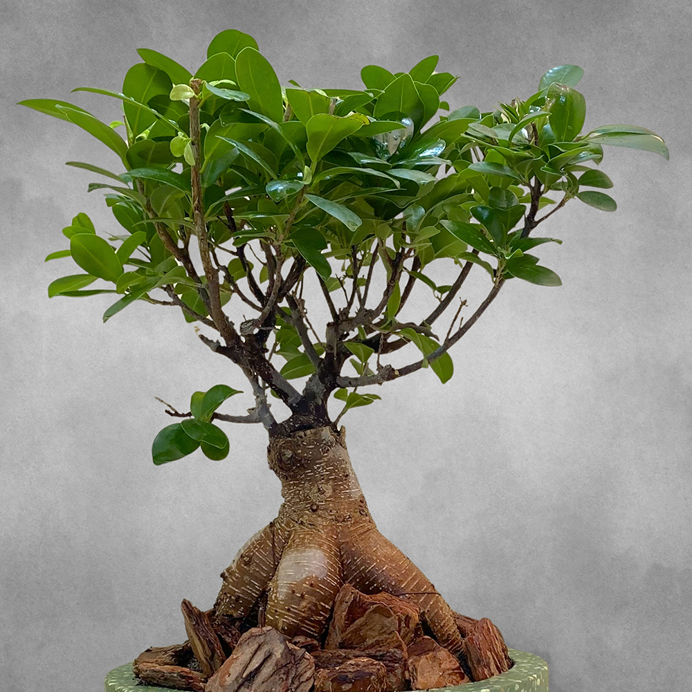 A bouquet containing a ficus gensing plant, arranged beautifully in a green ceramic pot.
