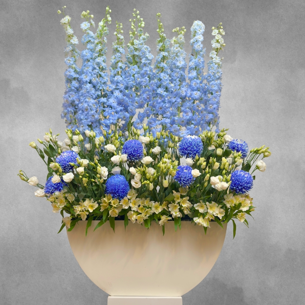 A bouquet containing alstroemerias, baby roses, baby carnations, chrysanthemums, and orchids, arranged beautifully in a black vase.