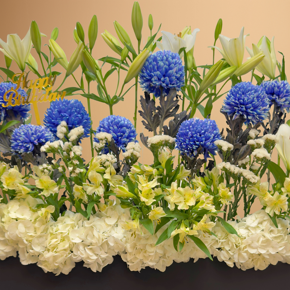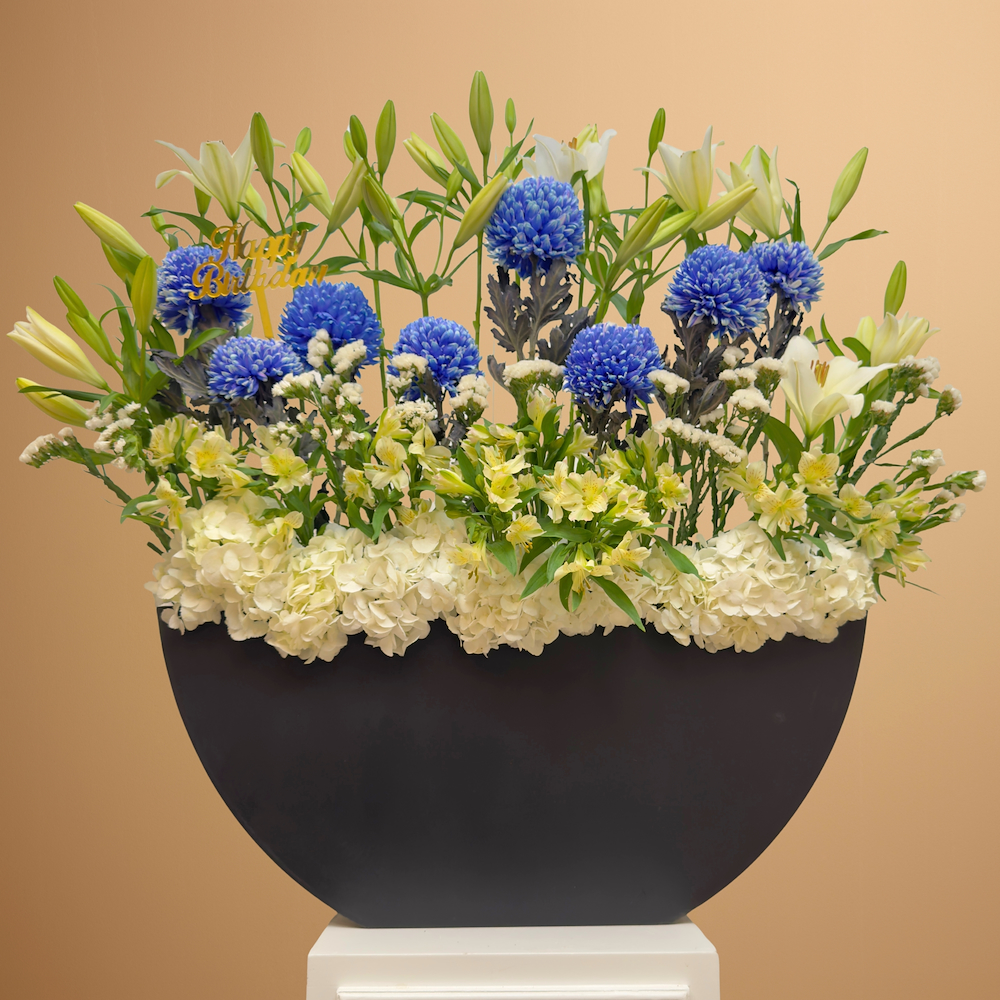 A bouquet containing lilies, hydrangeas, chrysanthemums, and alstroemerias, arranged beautifully in a black wood vase.