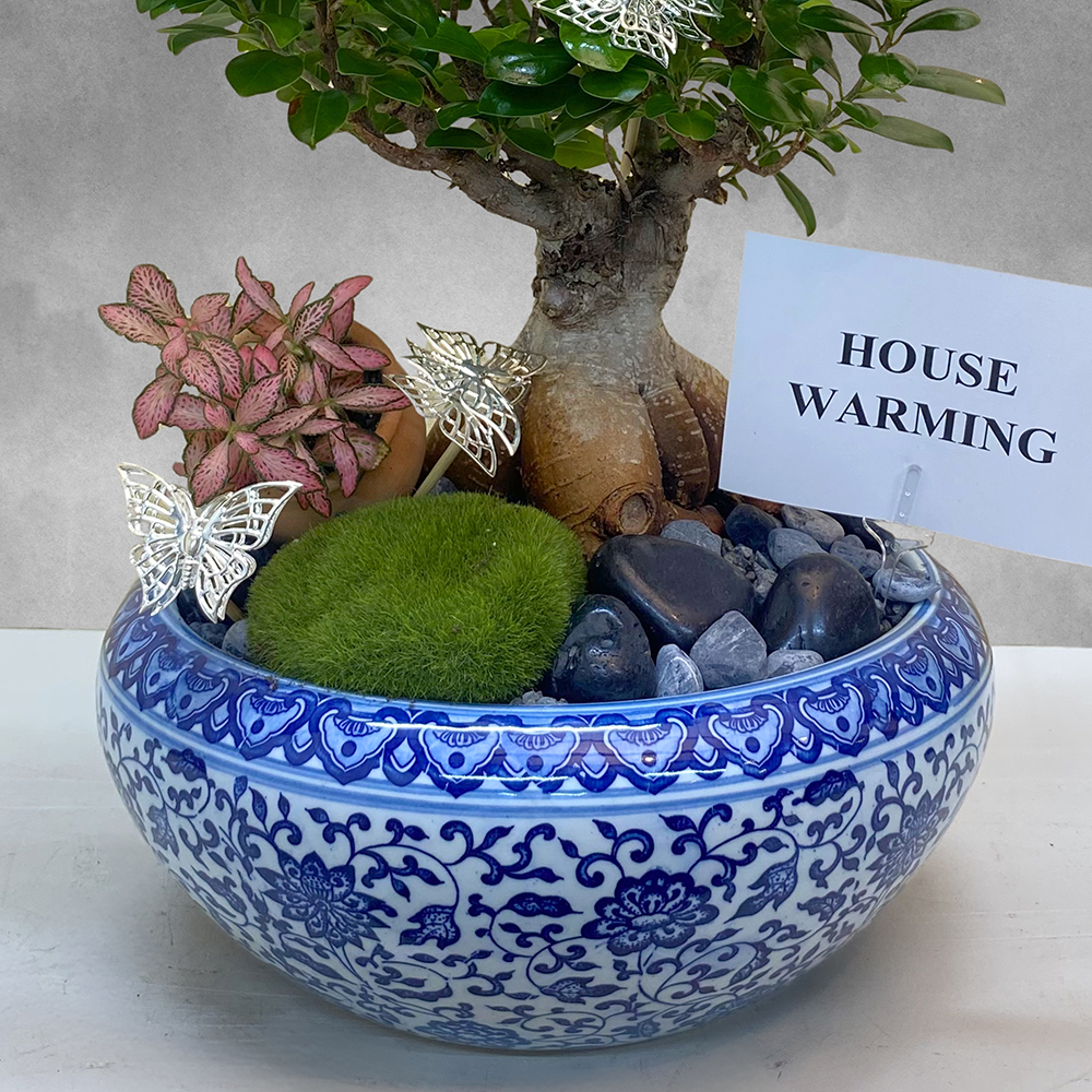 A blue ceramic pot arranged with ficus gensing bonsai and nerve plants.