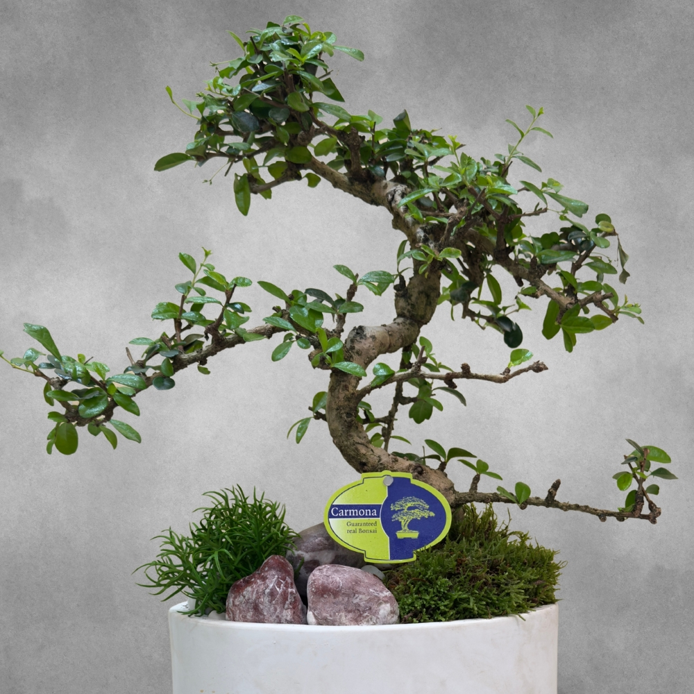A ceramic planter featuring snakey carmona bonsai plant.