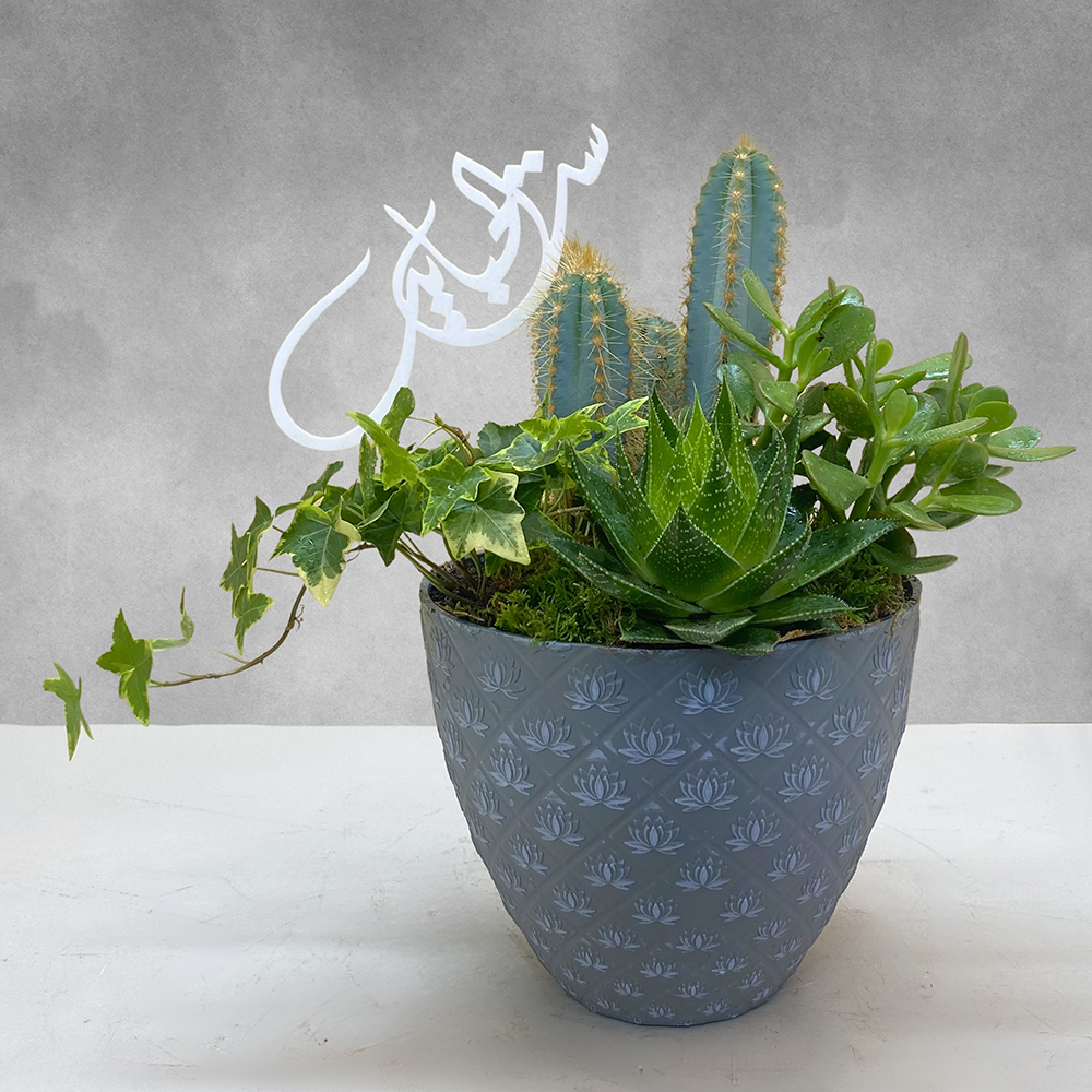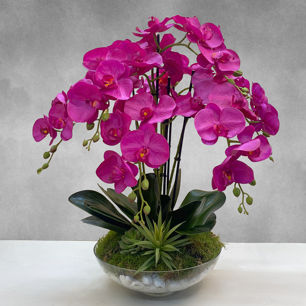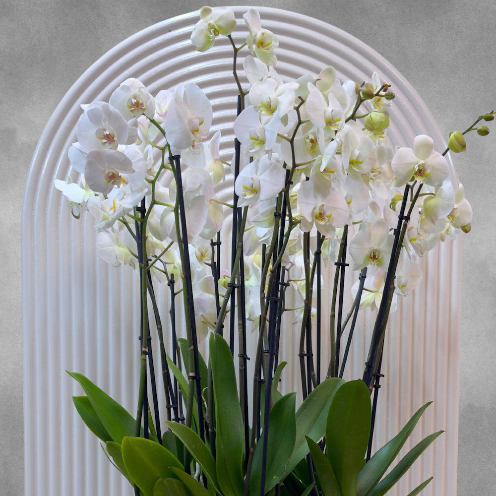 A bouquet containing white orchid plants, arranged beautifully in a beige pot.