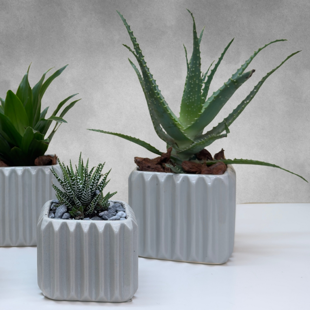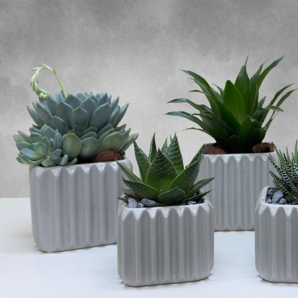 A set of 5 plants, including corvus, echeveria, and aloe aborecena, beautifully arranged in white ceramic vases. A modern and elegant display, perfect for brightening any space.