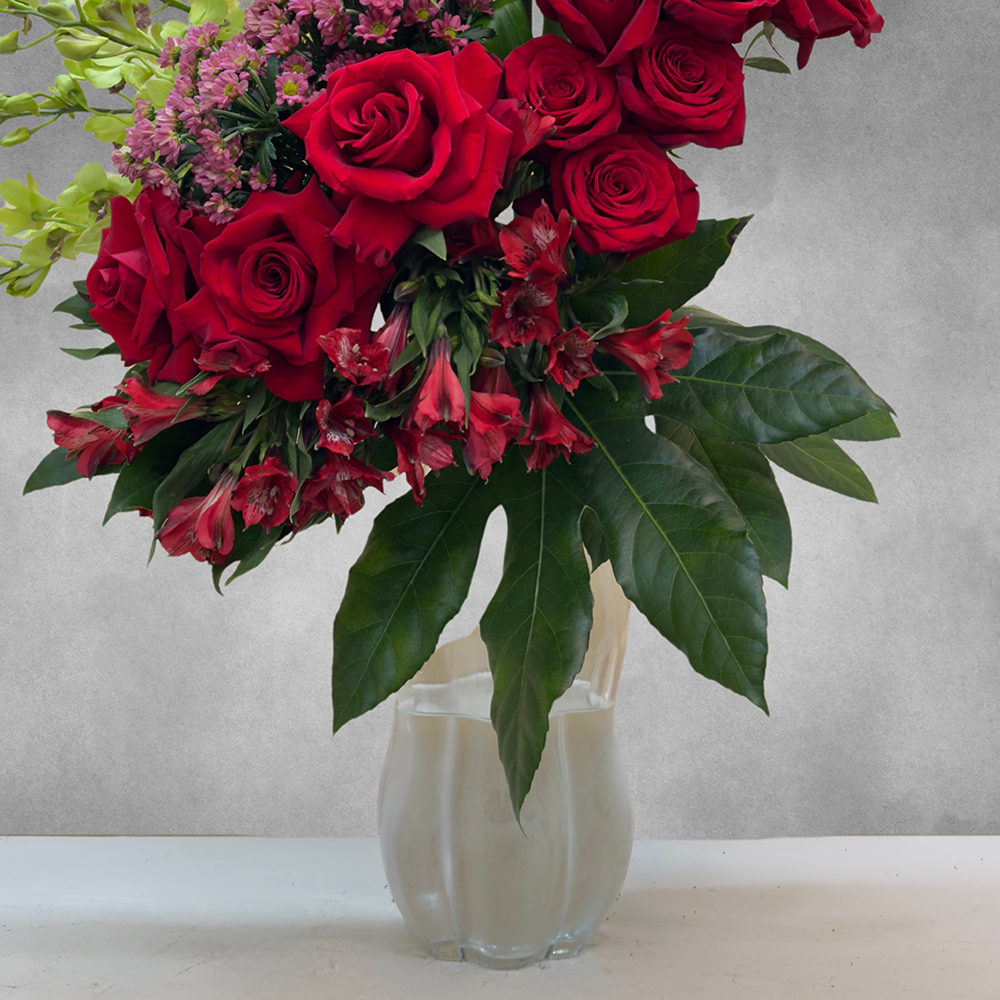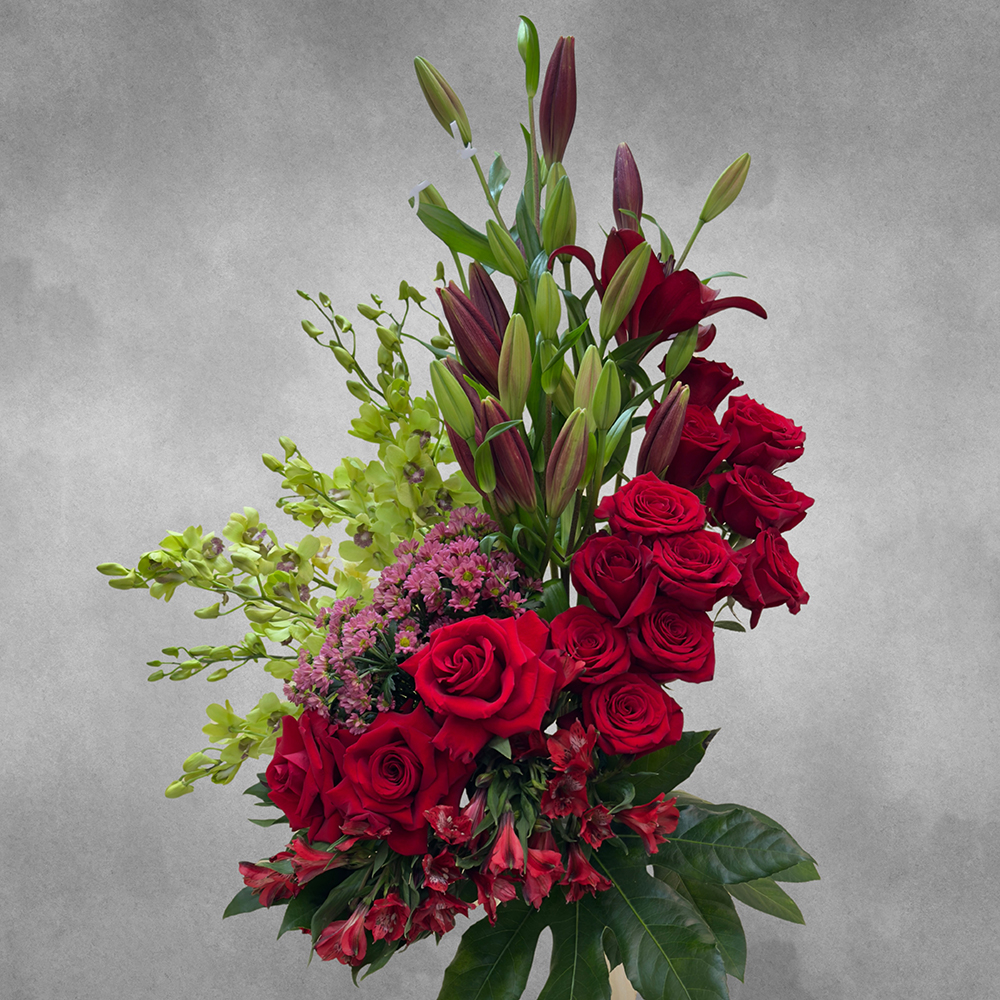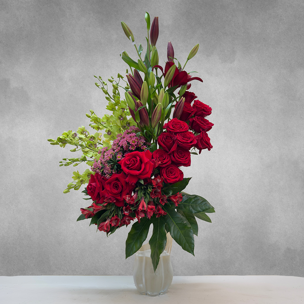 An elegant floral arrangement containing roses, lilies, orchids, chrysanthemums, and alstroemerias, beautifully combined for a vibrant and graceful display.