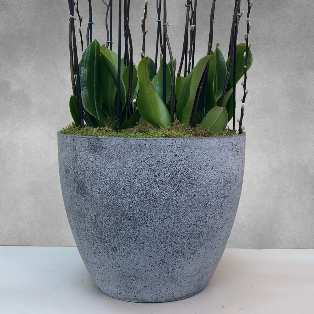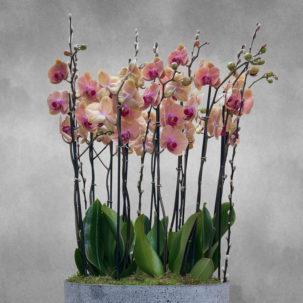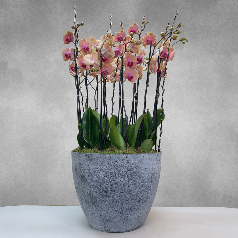 Caribbean dream peach orchid plants filled in a grey terrazo pot.