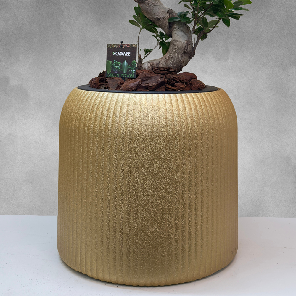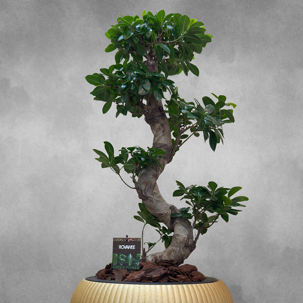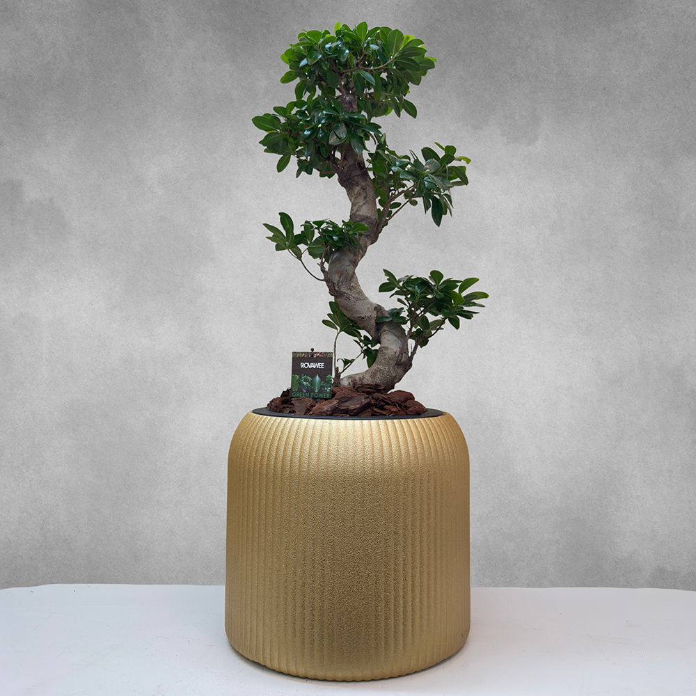 An S-line ficus microcarpa plant, elegantly planted in a golden fiber pot, creating a stylish and modern display.