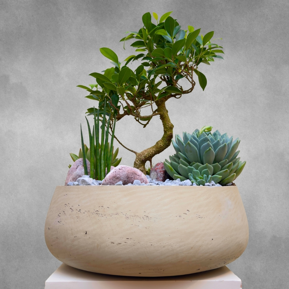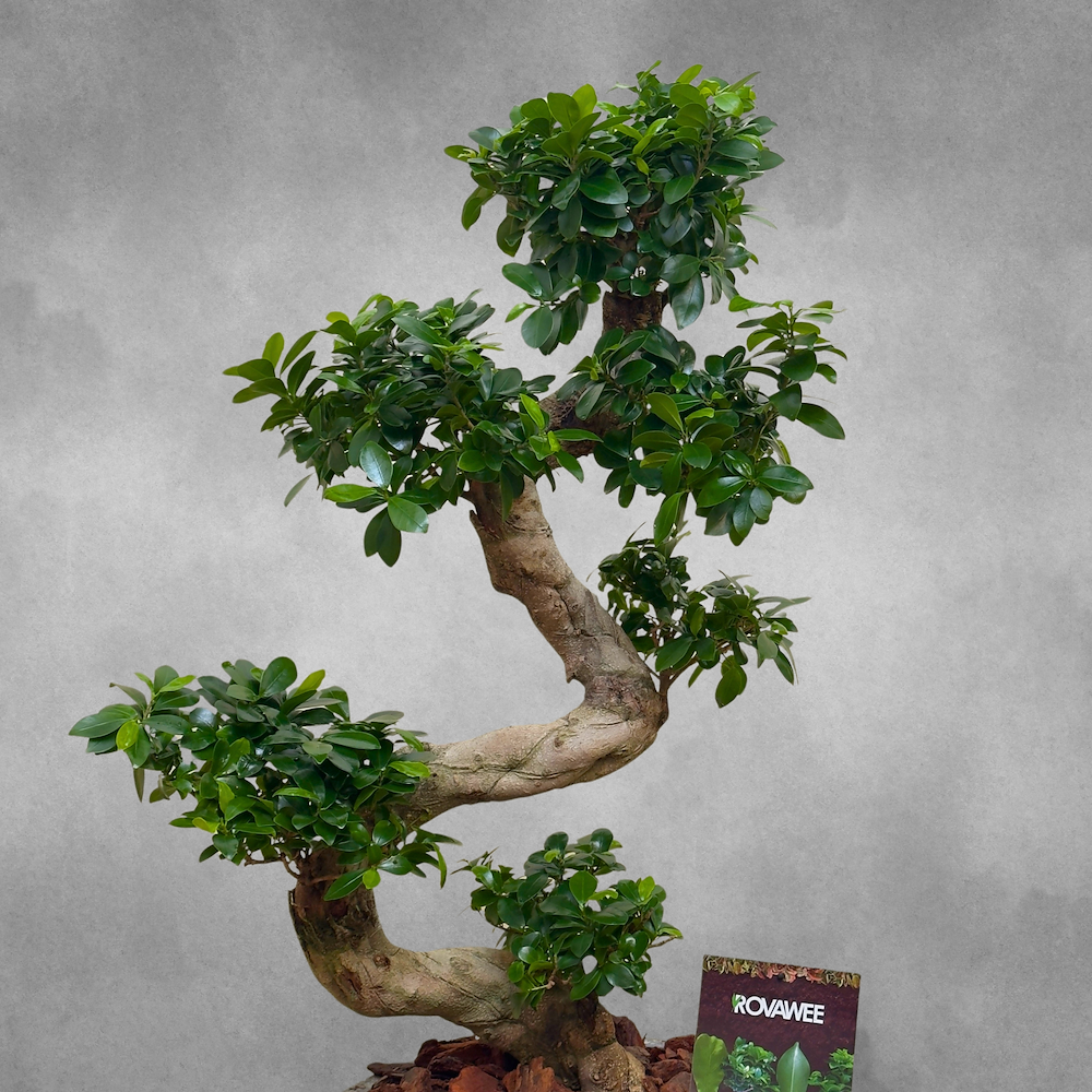 S line ficus ginseng microcarpa planted in a dark beige ceramic clay pot.