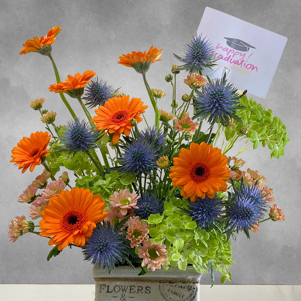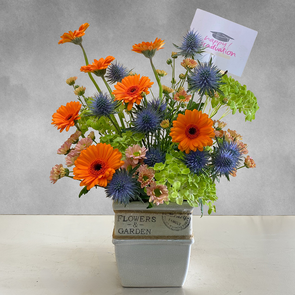 A bouquet containing gerberas, hydrangeas, chrysanthemums, eryngium, blue emerald, and santini, arranged beautifully in a ceramic vase.